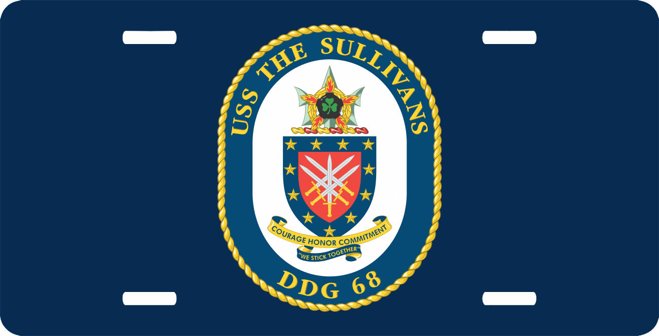 This Navy USS The Sullivans DDG-68 License Plate is made from heavy gauge aluminum and has a baked enamel finish to last for many years of use. Each plate measures 5 15/16" x 11 15/16". This license plate would make a wonderful addition to your collection or a great gift.
