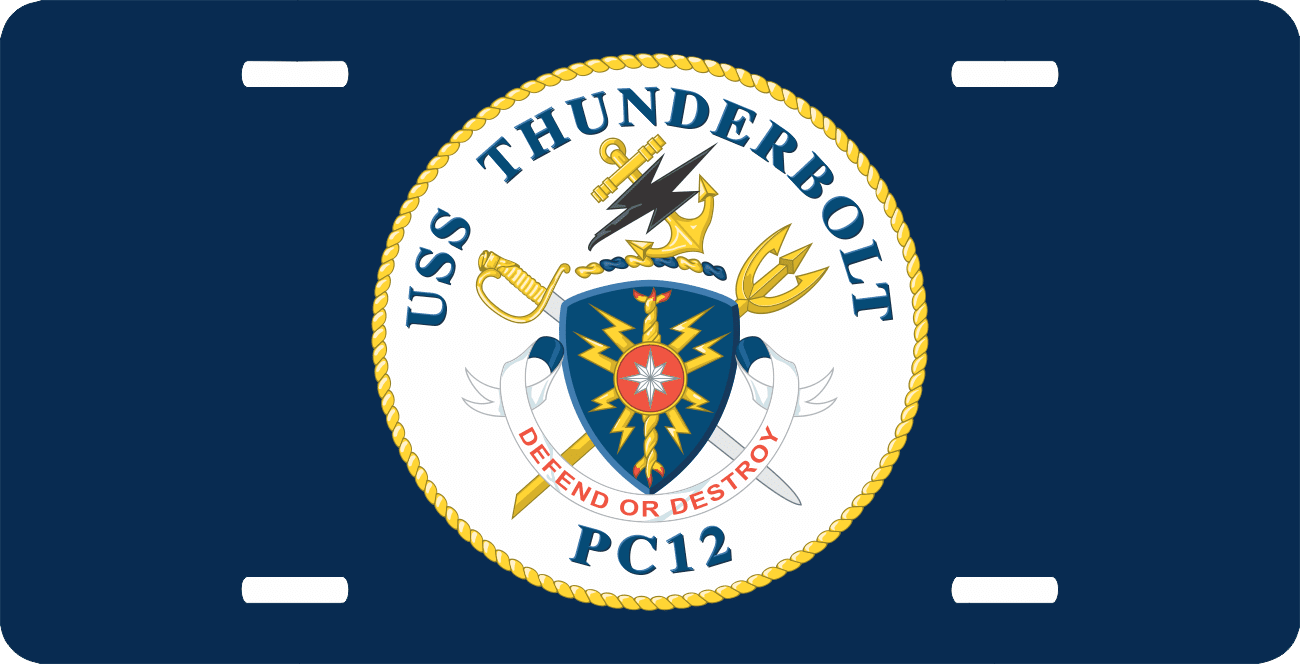 This Navy USS Thunderbolt PC-12 License Plate is made from heavy gauge aluminum and has a baked enamel finish to last for many years of use. Each plate measures 5 15/16" x 11 15/16". This license plate would make a wonderful addition to your collection or a great gift.