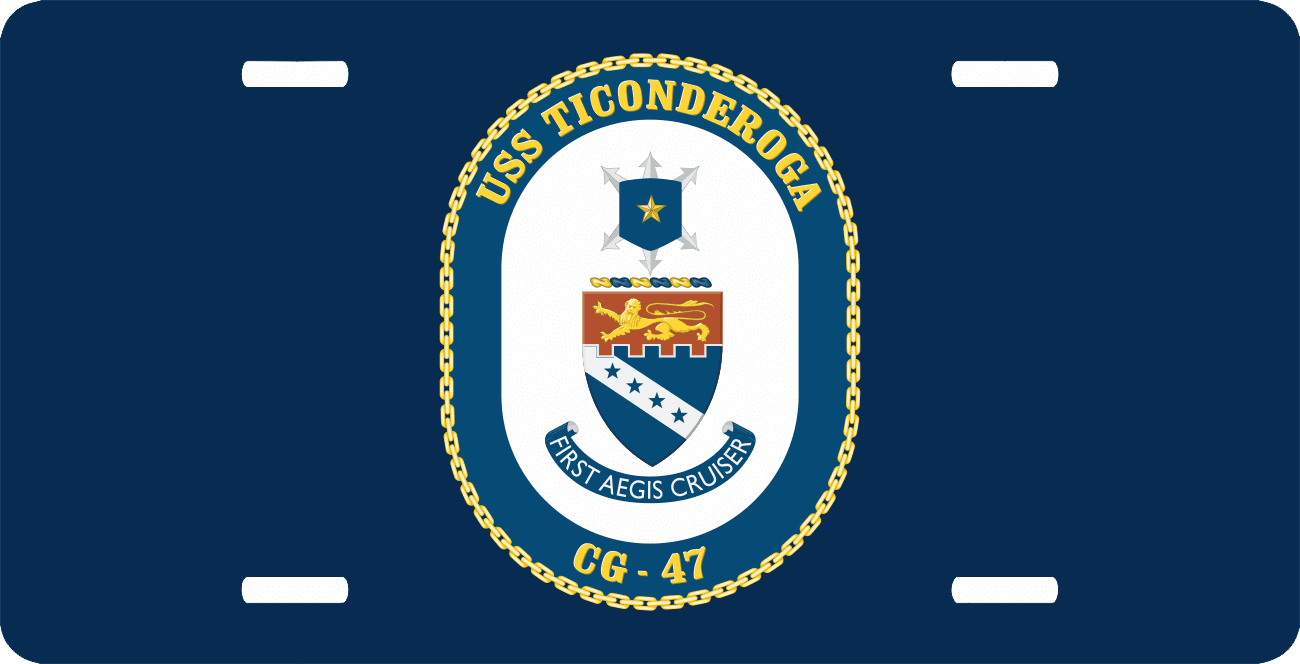 This Navy USS Ticonderoga CG-47 License Plate is made from heavy gauge aluminum and has a baked enamel finish to last for many years of use. Each plate measures 5 15/16" x 11 15/16". This license plate would make a wonderful addition to your collection or a great gift.