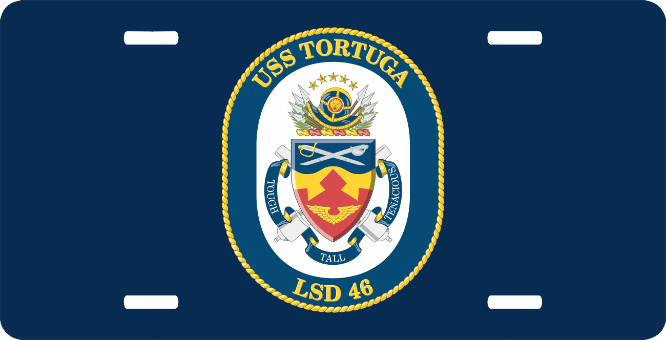 This Navy USS Tortuga LSD-46 License Plate is made from heavy gauge aluminum and has a baked enamel finish to last for many years of use. Each plate measures 5 15/16" x 11 15/16". This license plate would make a wonderful addition to your collection or a great gift.
