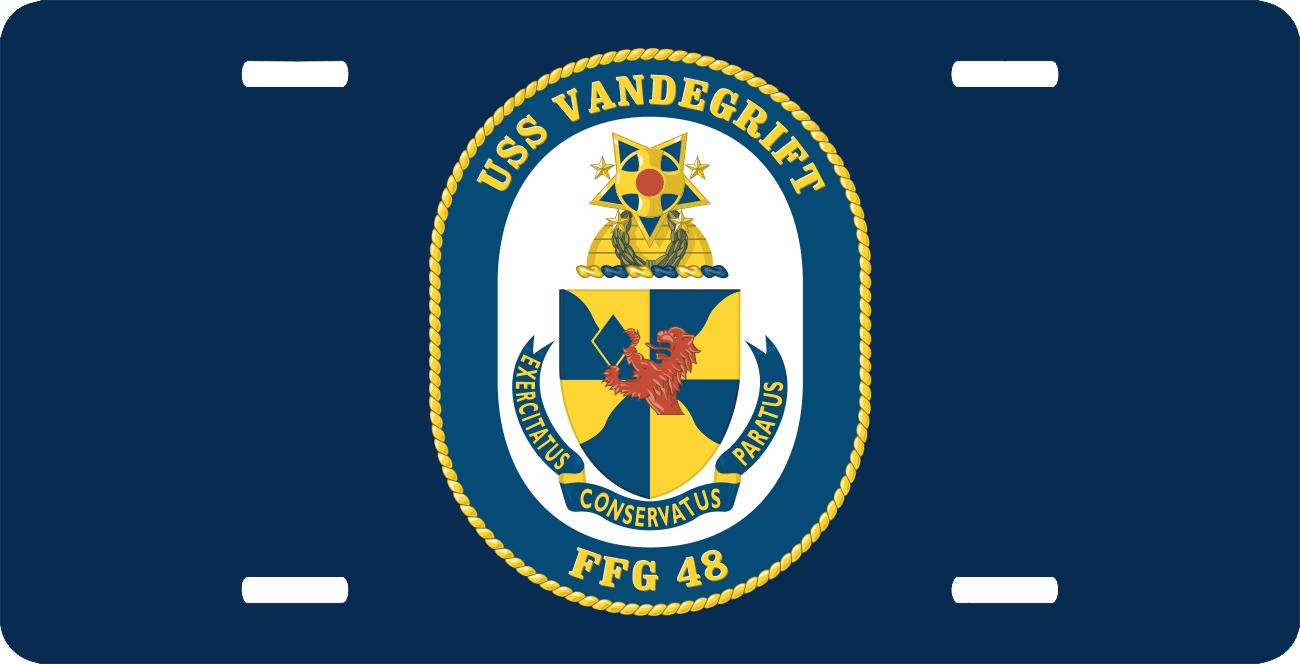 This Navy USS Vandegrift FFG-48 License Plate is made from heavy gauge aluminum and has a baked enamel finish to last for many years of use. Each plate measures 5 15/16" x 11 15/16". This license plate would make a wonderful addition to your collection or a great gift.