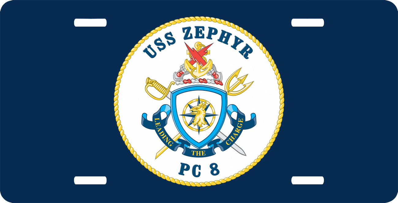 This Navy USS Zephyr PC-8 License Plate is made from heavy gauge aluminum and has a baked enamel finish to last for many years of use. Each plate measures 5 15/16" x 11 15/16". This license plate would make a wonderful addition to your collection or a great gift.