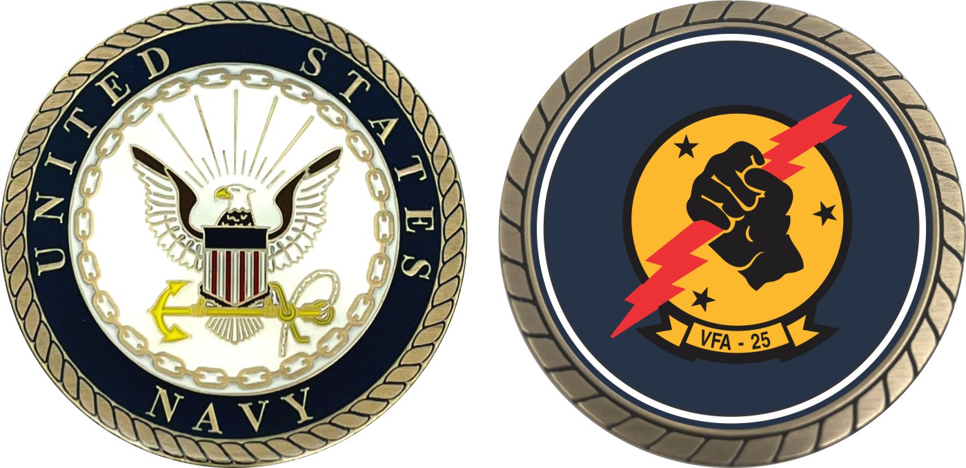 This 1 3/4” Navy VFA-25 Squadron Challenge Coin is proudly offered by Militarybest. This Officially Licensed Navy coin has beautiful enamel finish on one side and an organized crisp clean design on the opposite side.