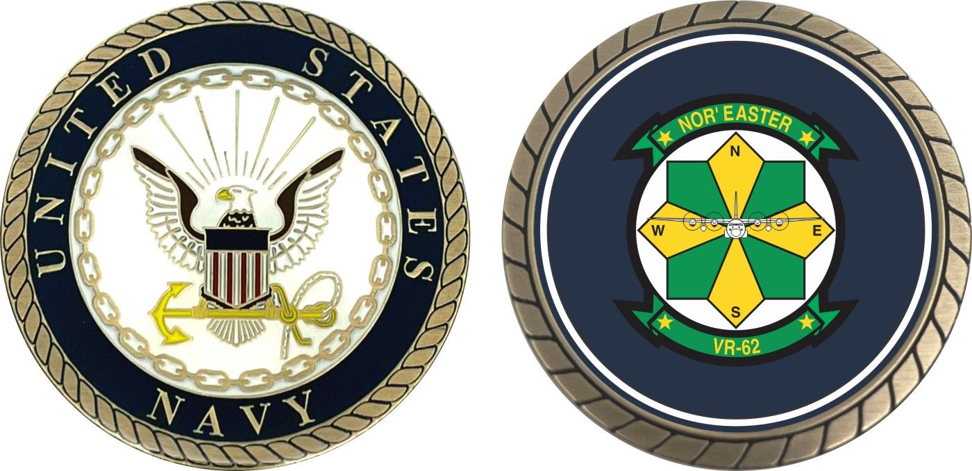 This 1 3/4” Navy VR-62 Squadron Challenge Coin is proudly offered by Militarybest. This Officially Licensed Navy coin has beautiful enamel finish on one side and an organized crisp clean design on the opposite side.