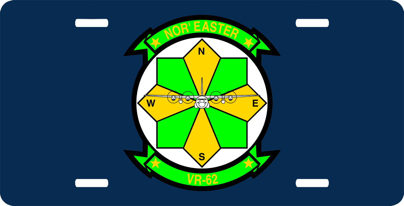 This Navy VR-62 Squadron License Plate is made from heavy gauge aluminum and has a baked enamel finish to last for many years of use. Each plate measures 5 15/16" x 11 15/16". This license plate would make a wonderful addition to your collection or a great gift.