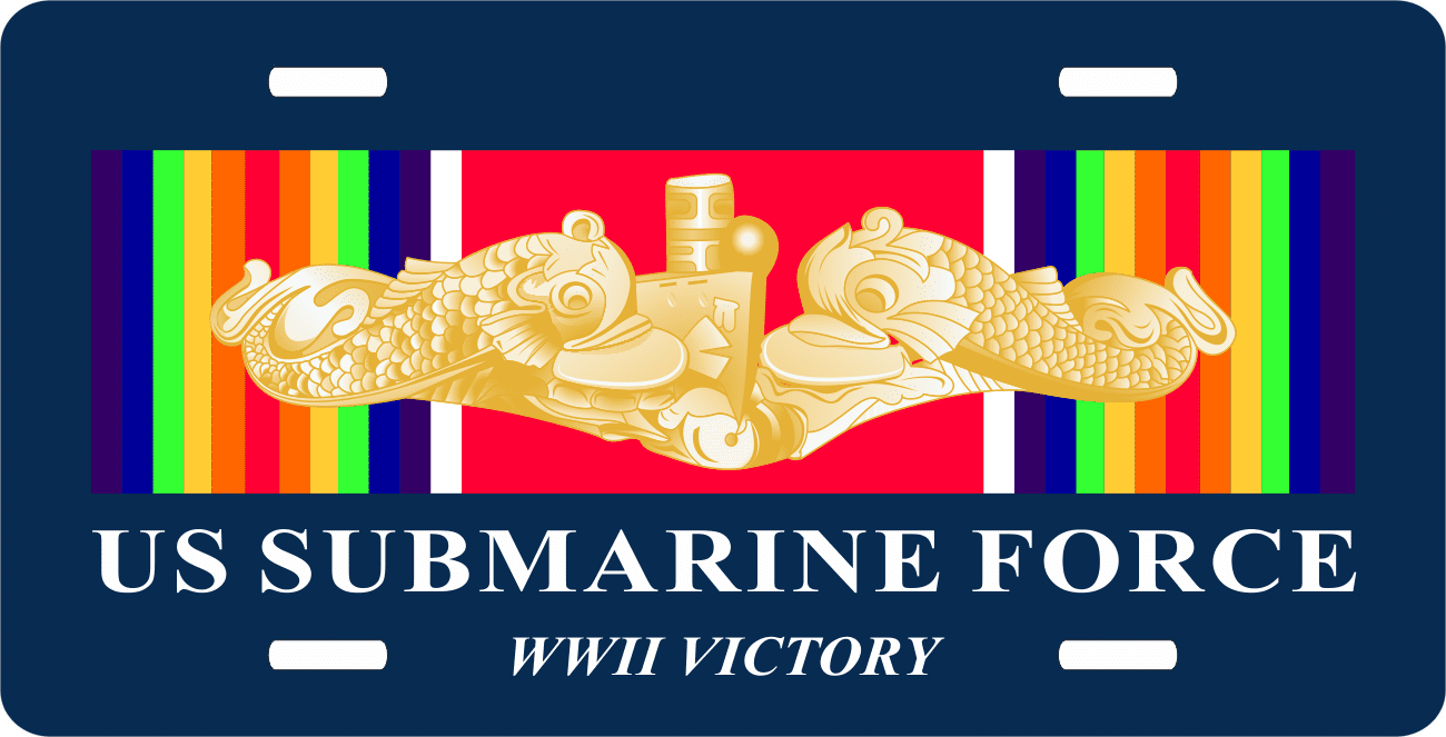This Navy World World Two Ribbon With Gold Dolphins License Plate is made from heavy gauge aluminum and has a baked enamel finish to last for many years of use. Each plate measures 5 15/16" x 11 15/16". This license plate would make a wonderful addition to your collection or a great gift.
