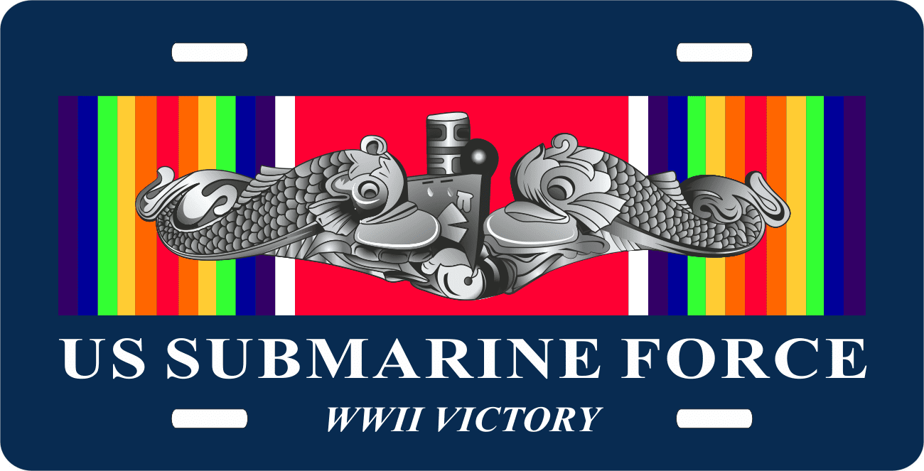 This Navy World World Two Ribbon With Silver Dolphins License Plate is made from heavy gauge aluminum and has a baked enamel finish to last for many years of use. Each plate measures 5 15/16" x 11 15/16". This license plate would make a wonderful addition to your collection or a great gift.