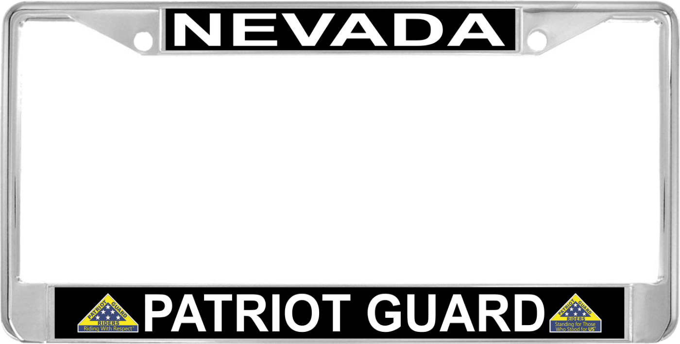 This Nevada Patriot Guard Automobile License Plate Frame is proudly produced at our facility in Scottsboro, Alabama. Each Chrome Dipped Alloy Frame has Poly Coated Aluminum Inserts which allow our production team to provide you with High Quality Designs. Unfortunately, this frame is not offered as a Motorcycle Frame.Please check with your state and local regulations regarding suitability for displaying this Automobile License Plate Frame on your vehicle since these regulations may have changed in your state. Various weather and road conditions may impact the life span of your frame e.g. salted roads, long exposure to direct sunlight etc.
