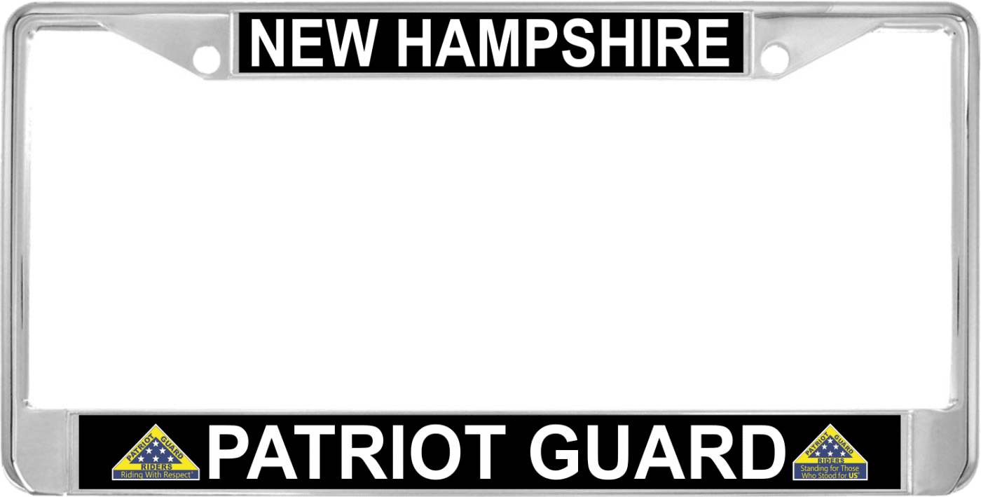 This New Hampshire Patriot Guard Automobile License Plate Frame is proudly produced at our facility in Scottsboro, Alabama. Each Chrome Dipped Alloy Frame has Poly Coated Aluminum Inserts which allow our production team to provide you with High Quality Designs. Unfortunately, this frame is not offered as a Motorcycle Frame.Please check with your state and local regulations regarding suitability for displaying this Automobile License Plate Frame on your vehicle since these regulations may have changed in your state. Various weather and road conditions may impact the life span of your frame e.g. salted roads, long exposure to direct sunlight etc.