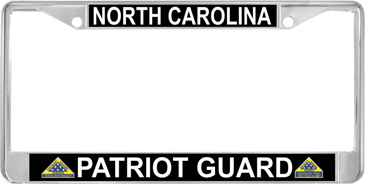 This North Carolina Patriot Guard Automobile License Plate Frame is proudly produced at our facility in Scottsboro, Alabama. Each Chrome Dipped Alloy Frame has Poly Coated Aluminum Inserts which allow our production team to provide you with High Quality Designs. Unfortunately, this frame is not offered as a Motorcycle Frame.Please check with your state and local regulations regarding suitability for displaying this Automobile License Plate Frame on your vehicle since these regulations may have changed in your state. Various weather and road conditions may impact the life span of your frame e.g. salted roads, long exposure to direct sunlight etc.