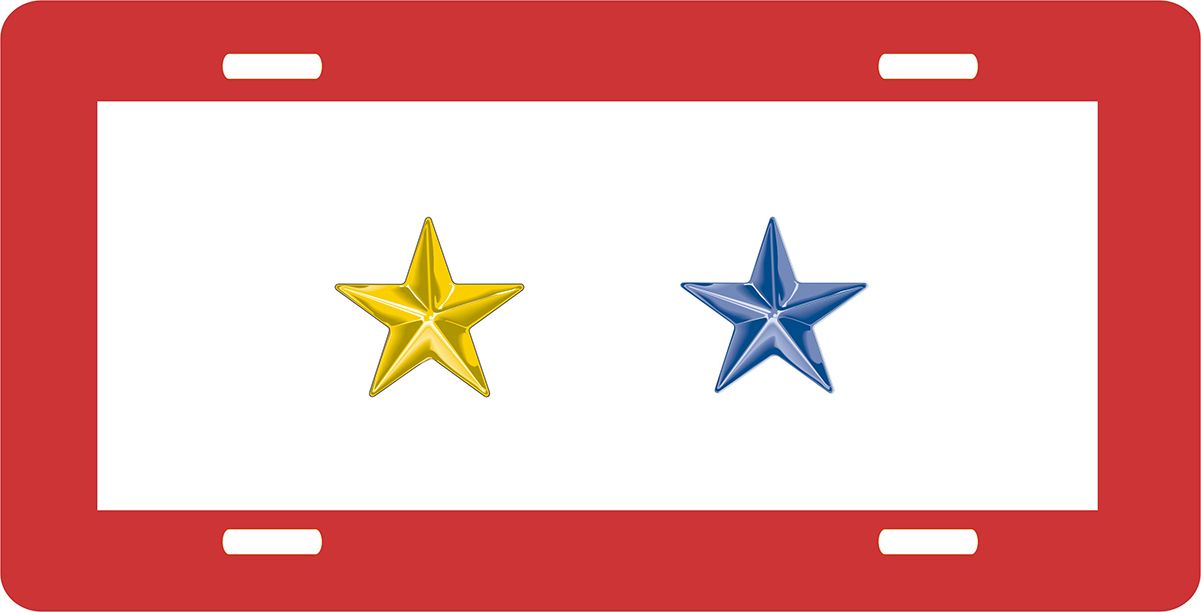 This One Gold Star and One Blue Star License Plate is made from heavy gauge aluminum and has a baked enamel finish to last for many years of use. Each plate measures 5 15/16" x 11 15/16". This license plate would make a wonderful addition to your collection or a great gift.