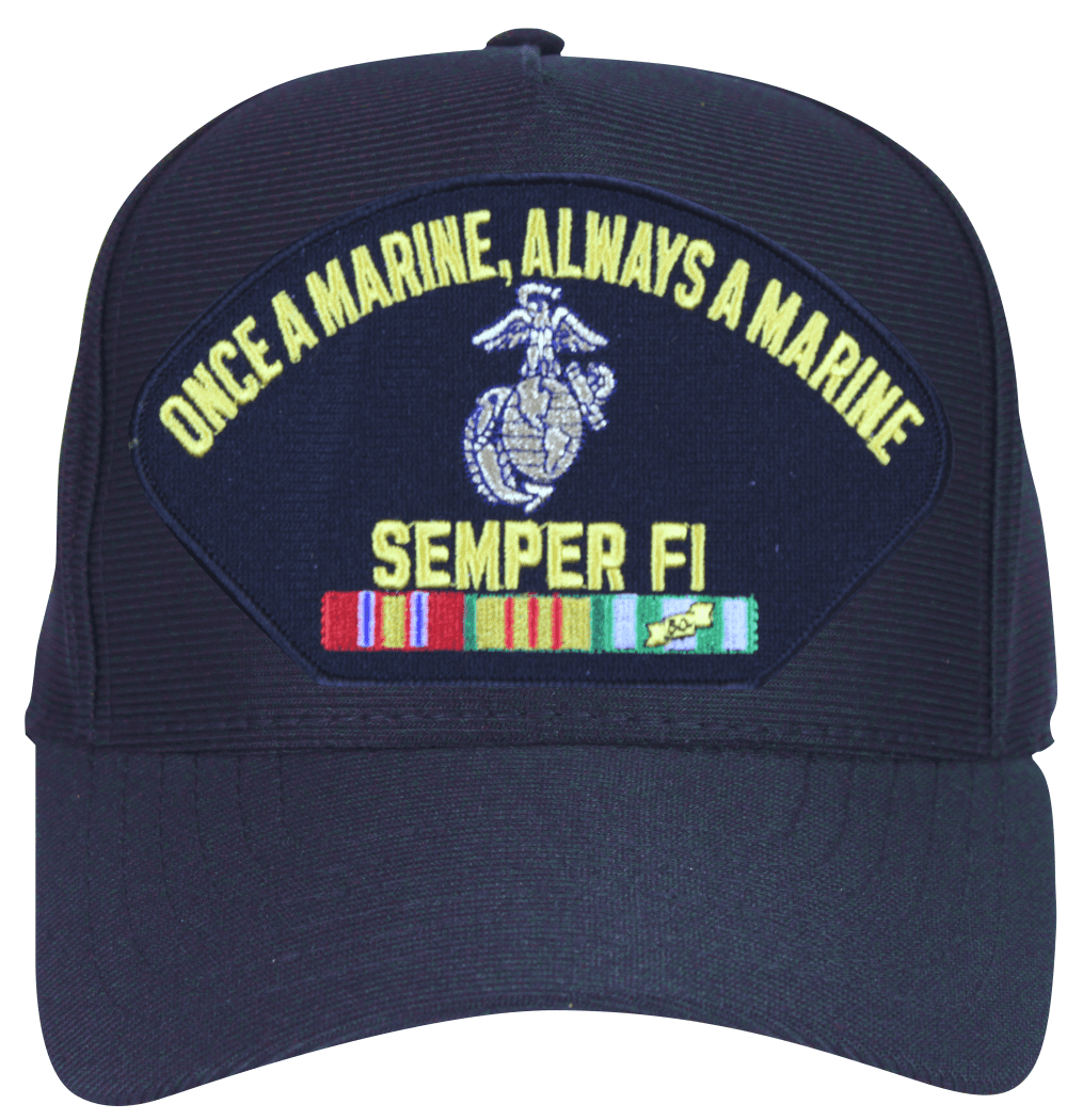 This ONCE A MARINE, ALWAYS A MARINE W/EGA SEMPER FI & VIETNAM VETERAN RIBBON SERIES MILITARY CAP is an emblematic, poly, dark under the visor cap. Each has an adjustable strap, and is available as a 5 panel high profile or 6 panel low profile cap. All MilitaryBest caps are fully guaranteed. Some people call them Military Covers or Military Hats. This Military Cap is proudly Made in The U.S.A.For caps ordered with custom embroidered personalized text please allow an additional 3 to 5 days production time. All custom back text will be embroidered in ALL CAPITAL LETTERS. Caps with back text or eggs are non-returnable unless there is a material defect in the cap. If a style is not selected the cap will be made using a high profile style cap as pictured.