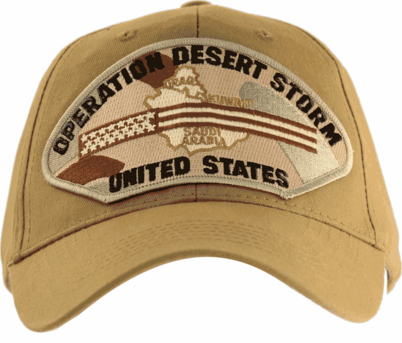 This United States Operation Desert Storm Ball Cap is six panel, emblematic, cotton twill cap., full back (not mesh) and Each has an adjustable strap. All our Military hats are fully guaranteed. Some people call them Military Covers or Military Hats. We will be glad to include scrambled eggs, which is an embroidered gold oak leaf added to the brim of the cap. For caps ordered with custom embroidered personalized text please allow an additional 3 to 5 days production time. All custom back text will be embroidered in ALL CAPITAL LETTERS. Caps with back text or eggs are non-returnable unless there is a material defect in the cap.
