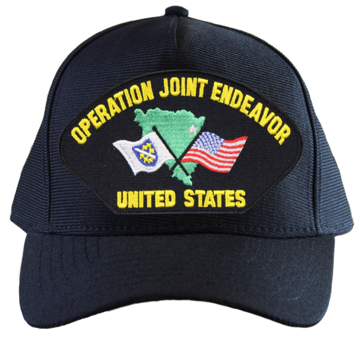 This Operation Joint Endeavor - United States Ball Cap is an emblematic, poly, dark under the visor cap. Each has an adjustable strap, and is available as a 5 panel high profile or 6 panel low profile cap. All MilitaryBest caps are fully guaranteed. Some people call them Military Covers or Military Hats. This Military Cap is proudly Made in The U.S.A.For caps ordered with custom embroidered personalized text please allow an additional 3 to 5 days production time. All custom back text will be embroidered in ALL CAPITAL LETTERS. Caps with back text or eggs are non-returnable unless there is a material defect in the cap. If a style is not selected the cap will be made using a high profile style cap as pictured.