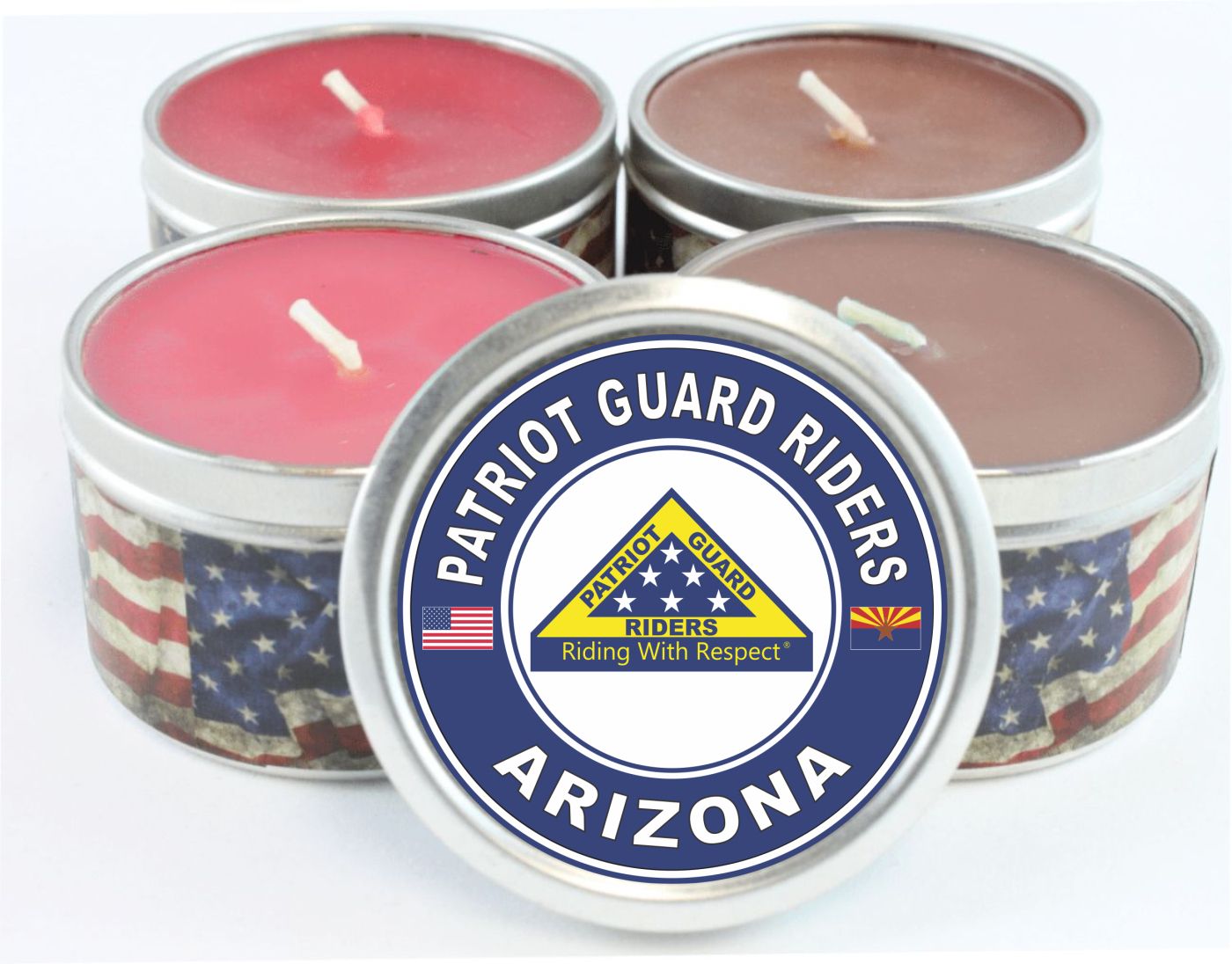 MilitaryBest is proud to offer this Patriot Guard Riders Arizona Scented Candle. Each candle features an American flag banner wrapped around the base with the Patriot Guard Riders design on the lid. These candles are manufactured with a custom mix of blended scents and paraffin wax of maximum purity and utilize zinc-cored wicks for cool, extended burning. The 4 Ounce candles have a burn time of 22-26 hours and the 8 Ounce candles have a burn time of 48 hours. These candles are made in the USA and their quality is guaranteed!