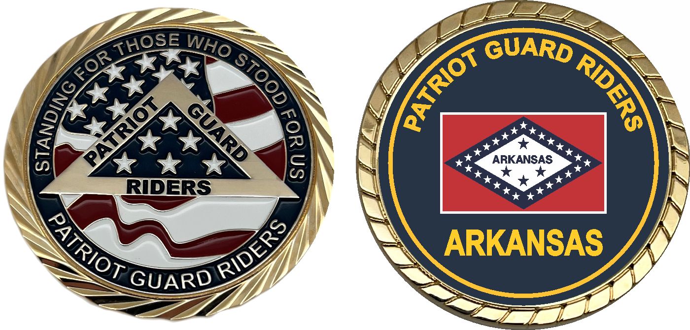 This 1 3/4” Patriot Guard Riders Arkansas Challenge Coin is proudly offered by MilitaryBest. This PGR coin has beautiful enamel finish on one side and an crisp clean Patriot Guard Riders Arkansas design on the opposite side.