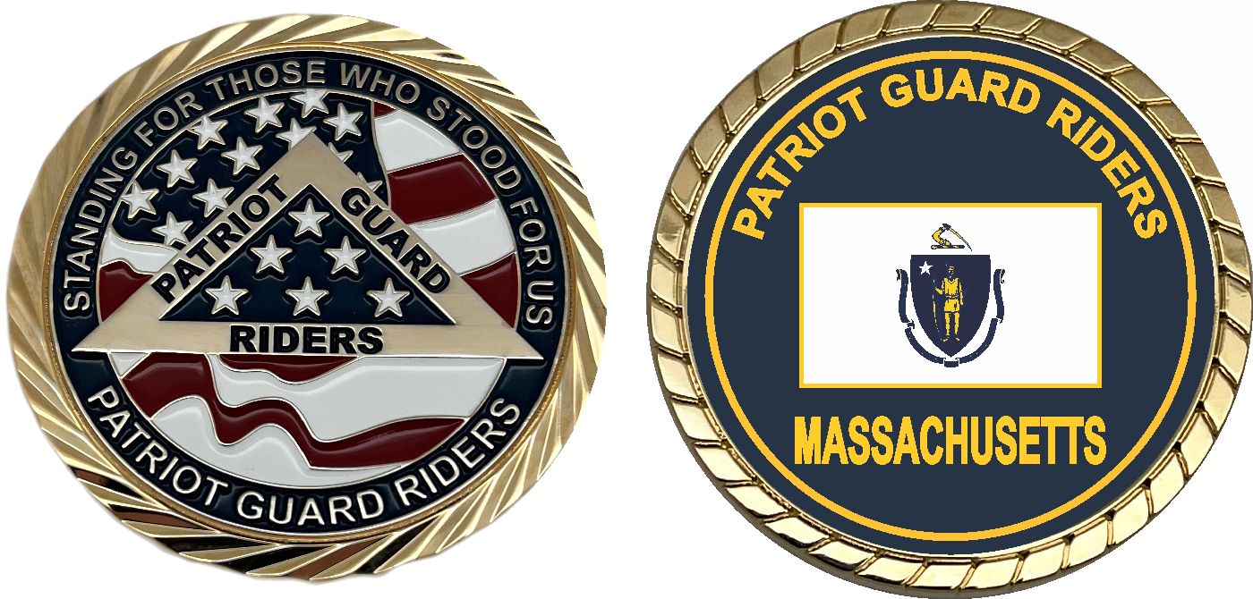 This 1 3/4” Patriot Guard Riders Massachusetts Challenge Coin is proudly offered by MilitaryBest. This PGR coin has beautiful enamel finish on one side and an crisp clean Patriot Guard Riders Massachusetts design on the opposite side.