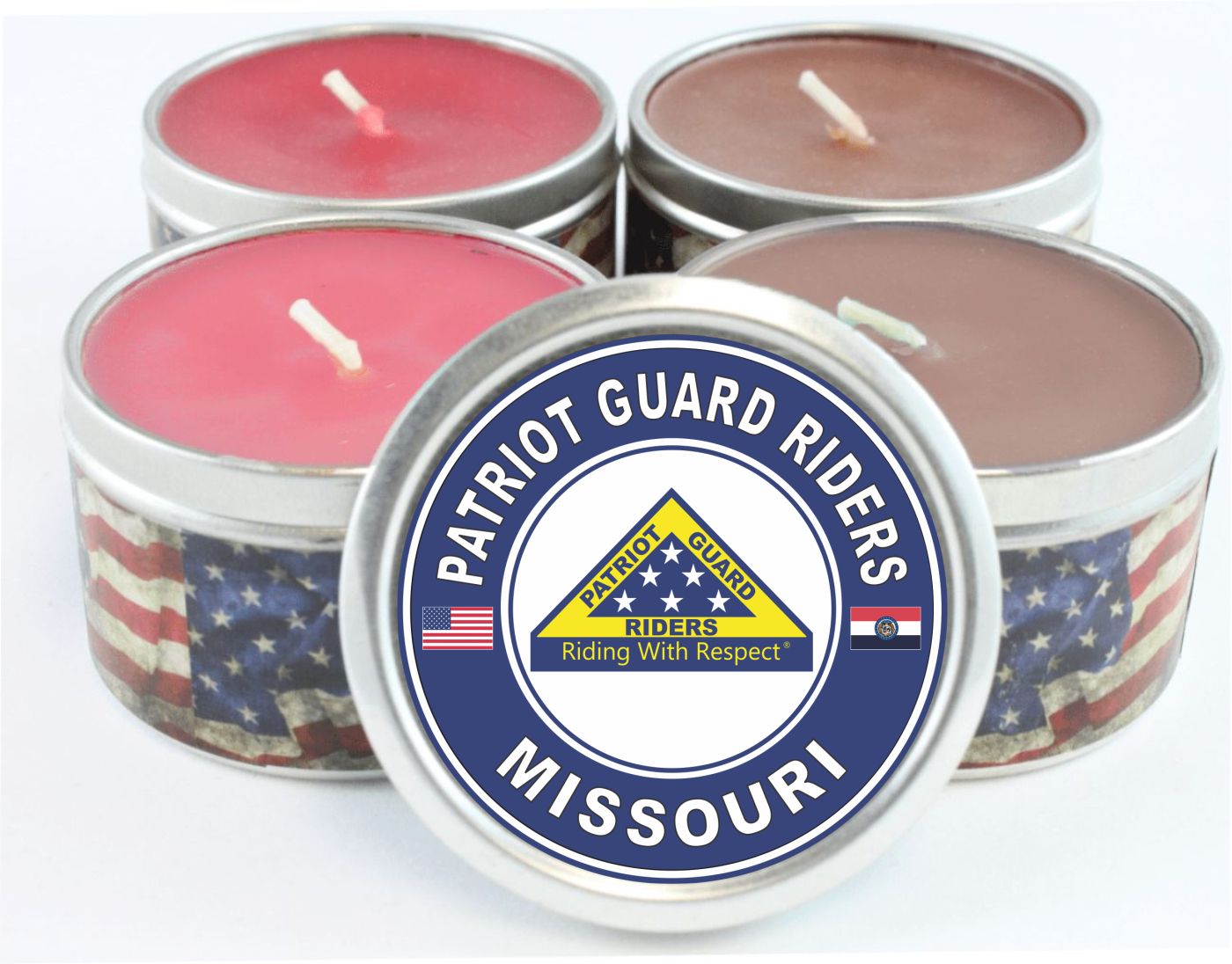 MilitaryBest is proud to offer this Patriot Guard Riders Missouri Scented Candle. Each candle features an American flag banner wrapped around the base with the Patriot Guard Riders design on the lid. These candles are manufactured with a custom mix of blended scents and paraffin wax of maximum purity and utilize zinc-cored wicks for cool, extended burning. The 4 Ounce candles have a burn time of 22-26 hours and the 8 Ounce candles have a burn time of 48 hours. These candles are made in the USA and their quality is guaranteed!