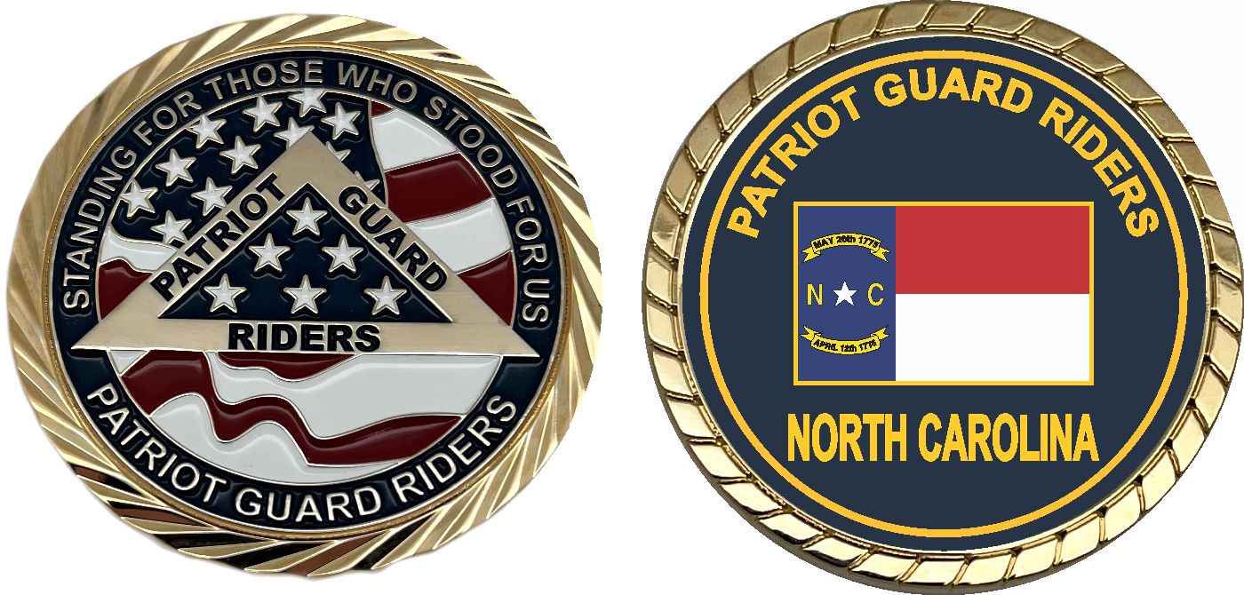 This 1 3/4” Patriot Guard Riders North Carolina Challenge Coin is proudly offered by MilitaryBest. This PGR coin has beautiful enamel finish on one side and an crisp clean Patriot Guard Riders North Carolina design on the opposite side.