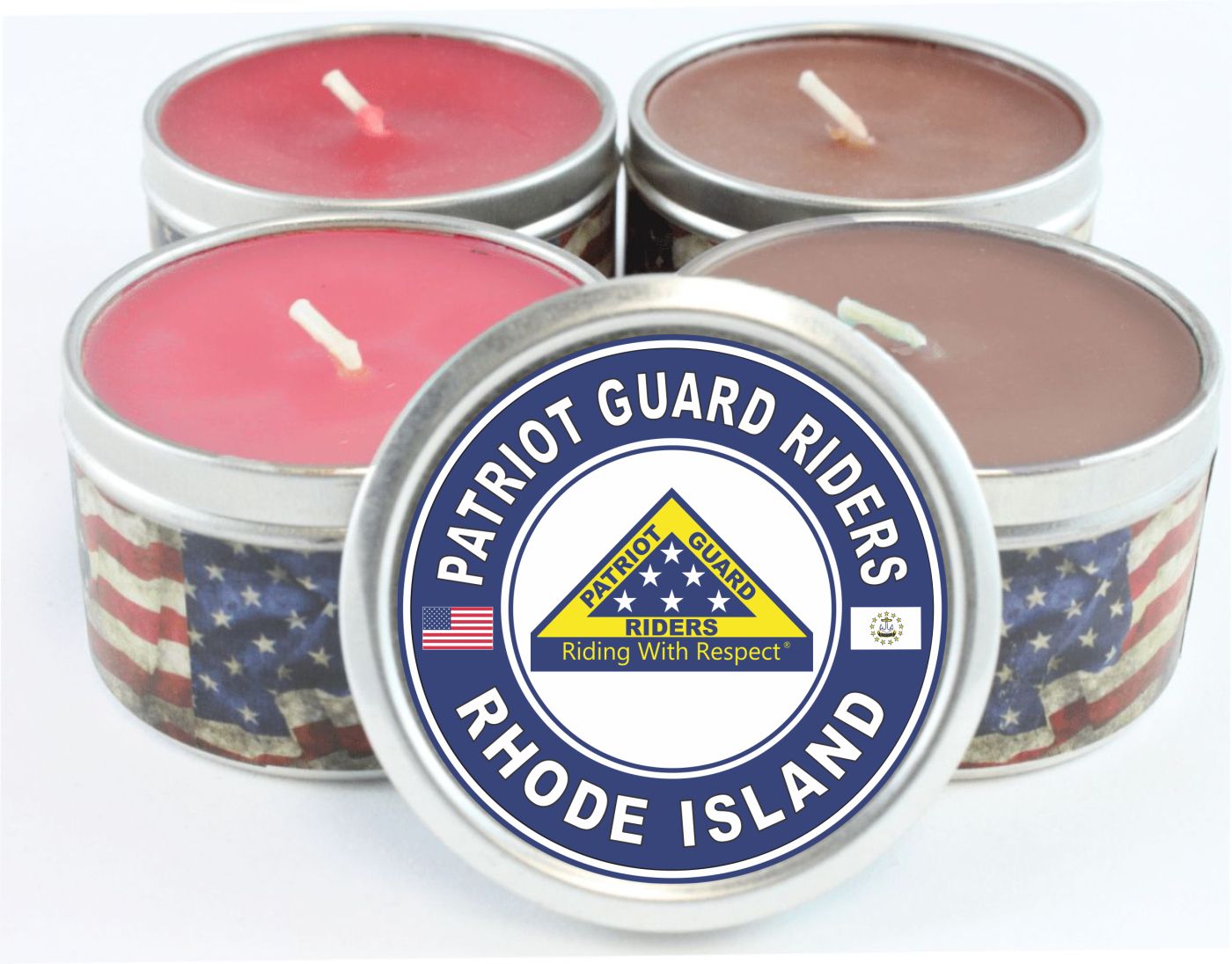 MilitaryBest is proud to offer this Patriot Guard Riders Rhode Island Scented Candle. Each candle features an American flag banner wrapped around the base with the Patriot Guard Riders design on the lid. These candles are manufactured with a custom mix of blended scents and paraffin wax of maximum purity and utilize zinc-cored wicks for cool, extended burning. The 4 Ounce candles have a burn time of 22-26 hours and the 8 Ounce candles have a burn time of 48 hours. These candles are made in the USA and their quality is guaranteed!