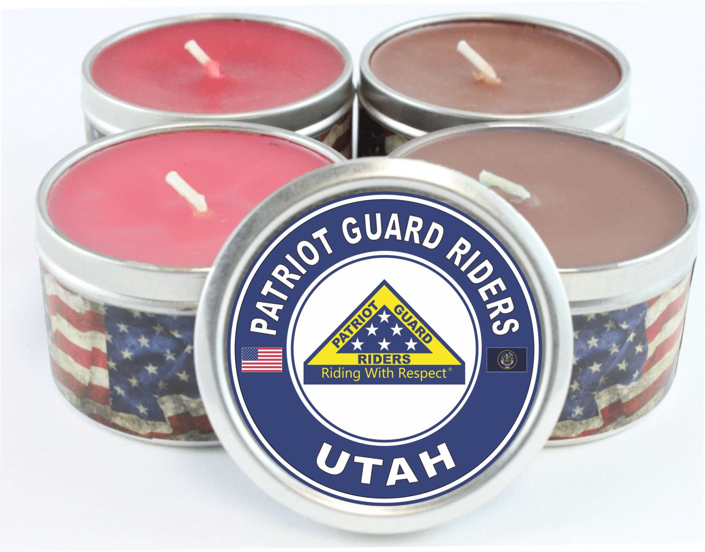 MilitaryBest is proud to offer this Patriot Guard Riders Utah Scented Candle. Each candle features an American flag banner wrapped around the base with the Patriot Guard Riders design on the lid. These candles are manufactured with a custom mix of blended scents and paraffin wax of maximum purity and utilize zinc-cored wicks for cool, extended burning. The 4 Ounce candles have a burn time of 22-26 hours and the 8 Ounce candles have a burn time of 48 hours. These candles are made in the USA and their quality is guaranteed!
