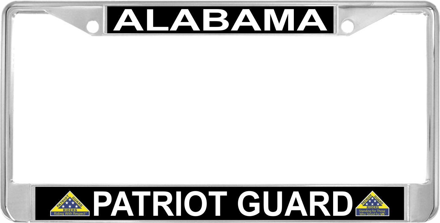 This Alabama Patriot Guard Automobile License Plate Frame is proudly produced at our facility in Scottsboro, Alabama. Each Chrome Dipped Alloy Frame has Poly Coated Aluminum Inserts which allow our production team to provide you with High Quality Designs. Unfortunately, this frame is not offered as a Motorcycle Frame.Please check with your state and local regulations regarding suitability for displaying this Automobile License Plate Frame on your vehicle since these regulations may have changed in your state. Various weather and road conditions may impact the life span of your frame e.g. salted roads, long exposure to direct sunlight etc.
