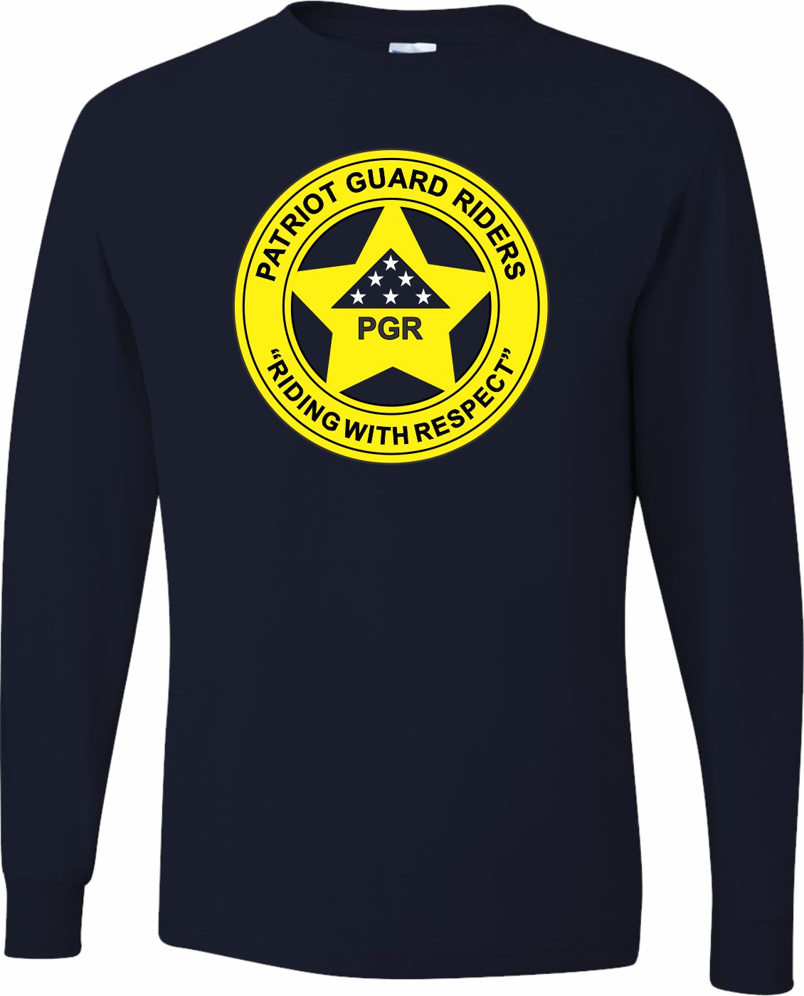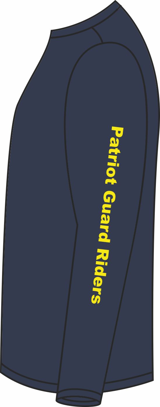 MilitaryBest is proud to offer this fine Patriot Guard Riders Concho Printed Long-Sleeve Navy Blue T-Shirt w/ "Patriot Guard Riders" on the Left Sleeve. This is a navy blue shirt that features the PGR Concho design on the center front of the shirt and "Patriot Guard Riders" in yellow running down the left sleeve. This long sleeve t-shirt is made using a pre-shrunk 50/50 cotton/polyester material.Each T-shirt is proudly printed in the USA.