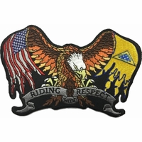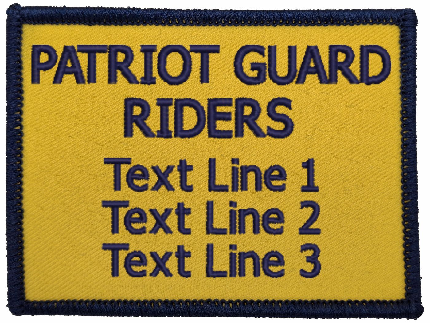 MilitaryBest is proud to offer this custom Patriot Guard Riders patch. Select and enter up to three lines of text underneath "PATRIOT GUARD RIDERS". Custom text will be the same height for all three lines. This patch measures 4" wide by 3" tall. This patch is yellow with a blue merrow border.
