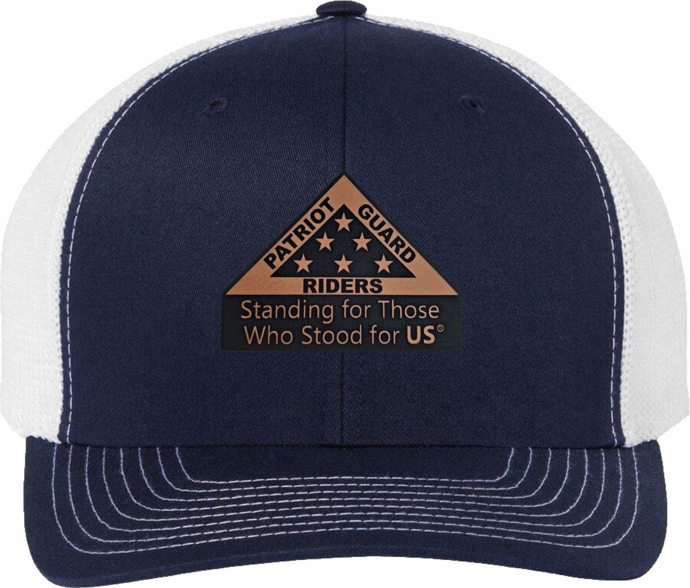 We are proud to offer this Patriot Guard Riders Leather Patch Cap (Made in the USA). These caps are 100% Made in the USA! Each leather patch is colored leather brown and black, they are applied to a 6 Panel - Mid Profile cap. All of our 2-tone colored caps are made with a white mesh backing.Caps ordered with custom embroidered personalized back text require an additional 2 to 3 days production time. All custom text will be embroidered in ALL CAPITAL LETTERS. Caps personalized with back text are non-returnable unless there is a material defect in the cap.