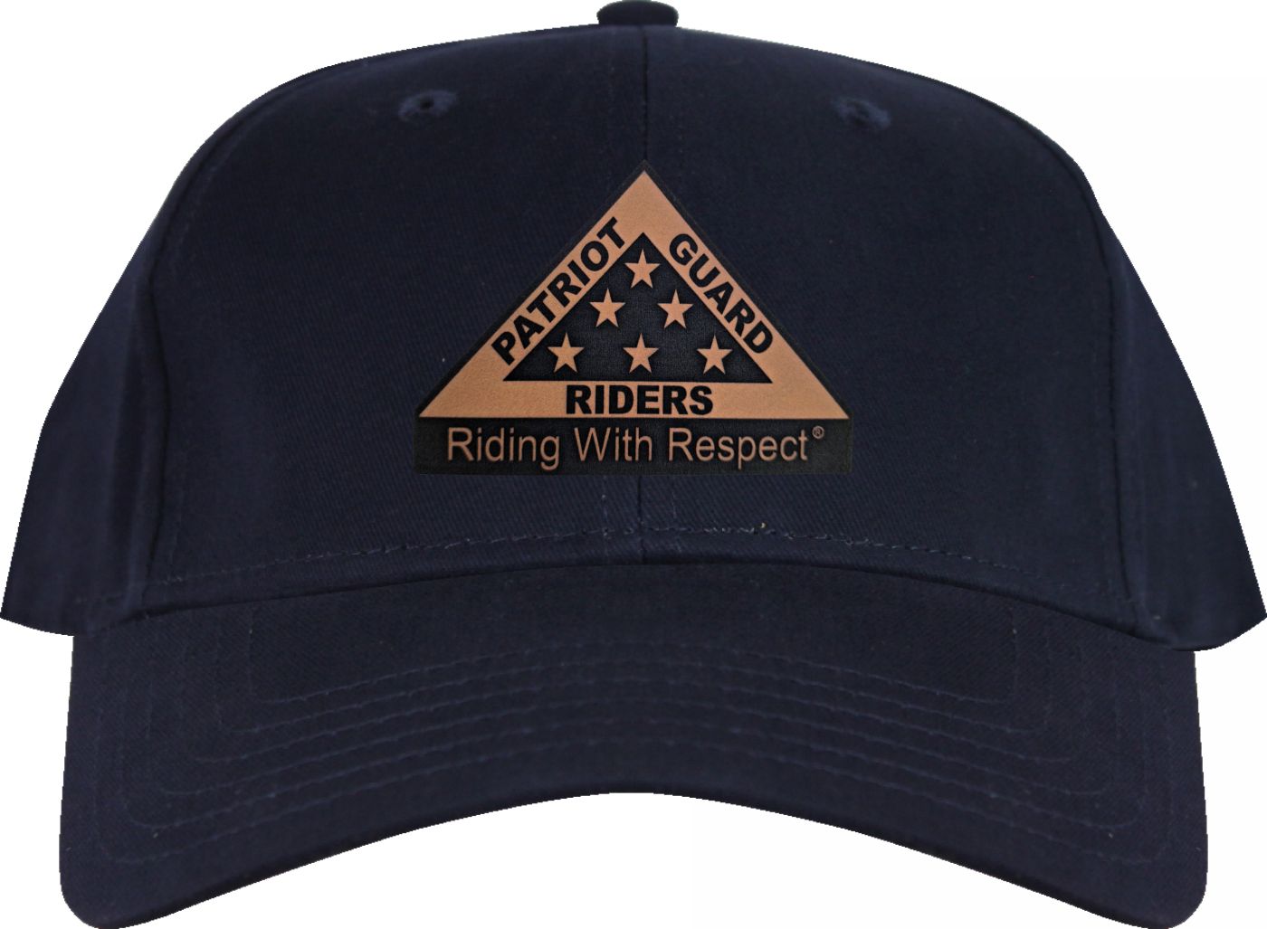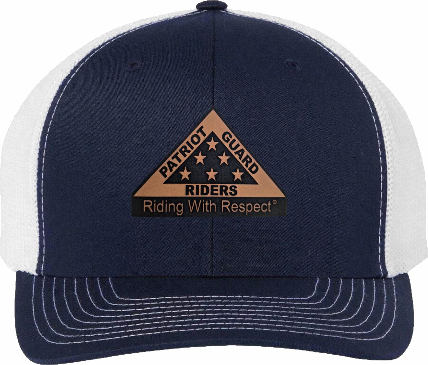 We are proud to offer this Patriot Guard Riders "Riding With Respect" Leather Patch Cap. These caps are 100% Made in the USA! Each leather patch is colored leather brown and black, they are applied to a 6 Panel - Mid Profile cap. All of our 2-tone colored caps are made with a white mesh backing.Caps ordered with custom embroidered personalized back text require an additional 2 to 3 days production time. All custom back text will be embroidered in ALL CAPITAL LETTERS. Caps personalized with back text are non-returnable unless there is a material defect in the cap.