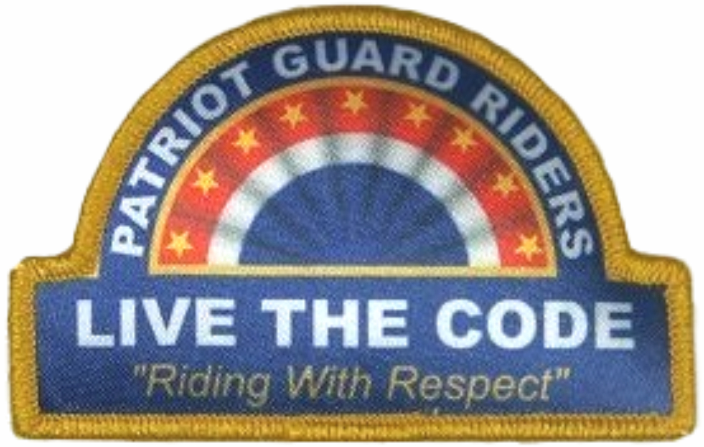 We are proud to offer this Patriot Guard Live the Code "Riding with Respect" Patch. This patch measures 4" wide x 2 1/2" tall
