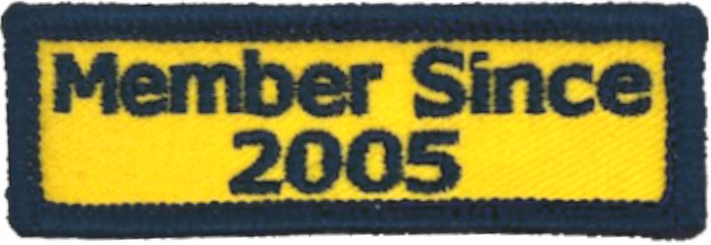 This Patriot Guard Riders Member Patch is a 3" wide x 1/2" tall yellow felt patch with a blue border. Embroidered with "Member Since 2005"