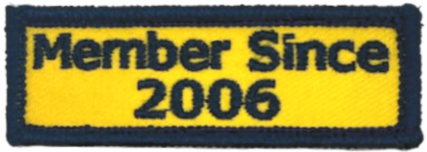 This Patriot Guard Riders Member Patch is a 3" wide x 1/2" tall yellow felt patch with a blue border. Embroidered with "Member Since 2006"