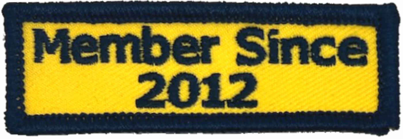 This Patriot Guard Riders Member Patch is a 3" wide x 1/2" tall yellow felt patch with a blue border. Embroidered with "Member Since 2012"
