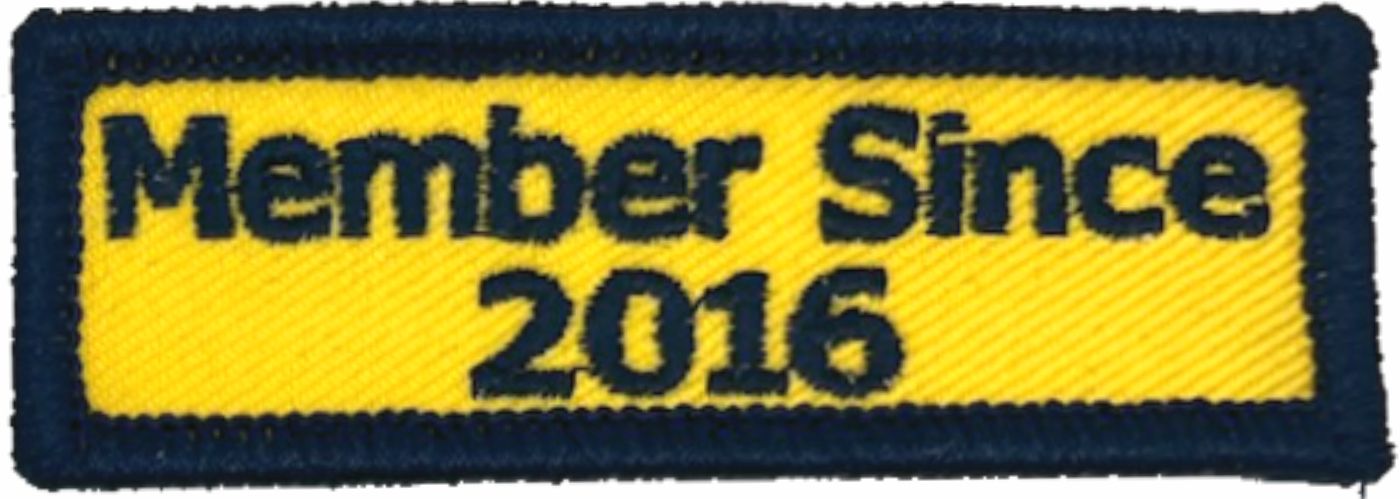 This Patriot Guard Riders Member Patch is a 3" wide x 1/2" tall yellow felt patch with a blue border. Embroidered with "Member Since 2016"