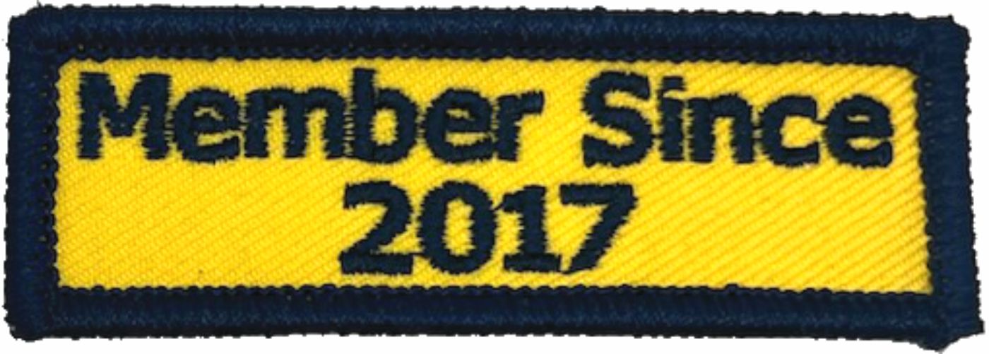 This Patriot Guard Riders Member Patch is a 3" wide x 1/2" tall yellow felt patch with a blue border. Embroidered with "Member Since 2017"