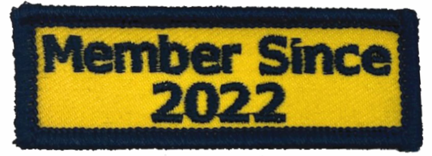 This Patriot Guard Riders Member Patch is a 3" wide x 1/2" tall yellow felt patch with a blue border. Embroidered with "Member Since 2022"