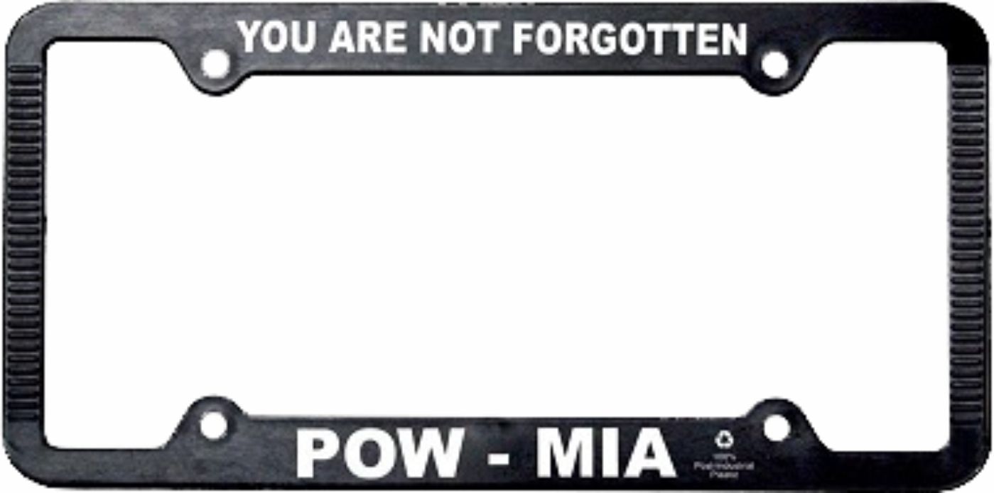 We are proud to offer this POW/MIA License Plate Frame. This frame will have "You Are Not Forgotten" at the top and "POW-MIA" along the bottom. This frame is made of a plastic type material that comes from recycled electronics.