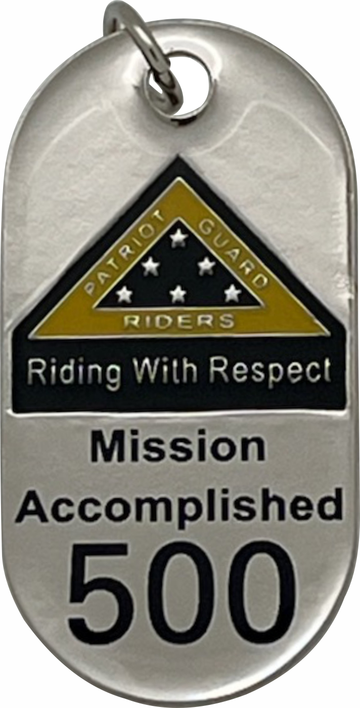 Thank you for your Patriot Guard Mission Support. This 500 Mission pin with clutch back attachment measures 1 5/8" tall x 3/4" wide.*** Pressing this pin into thick leather can result in breaking of pin. It is recommended to make holes through our leather via another method before attaching the pin ***