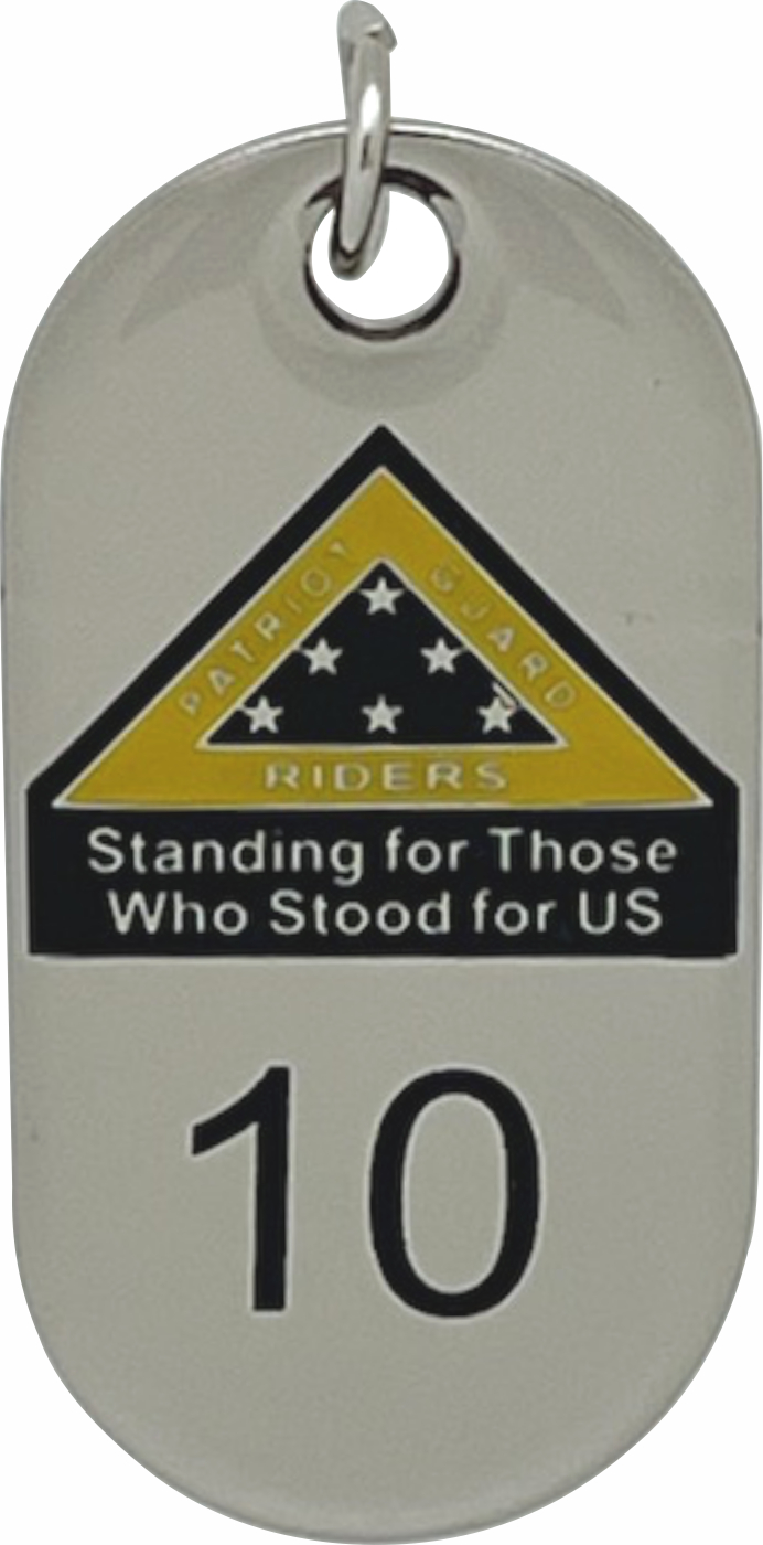Thank you for your Patriot Guard Mission Support. This 10 Mission pin with clutch back attachment measures 1 3/4" tall x 7/8" wide.*** Pressing this pin into thick leather can result in breaking of pin. It is recommended to make holes through our leather via another method before attaching the pin ***