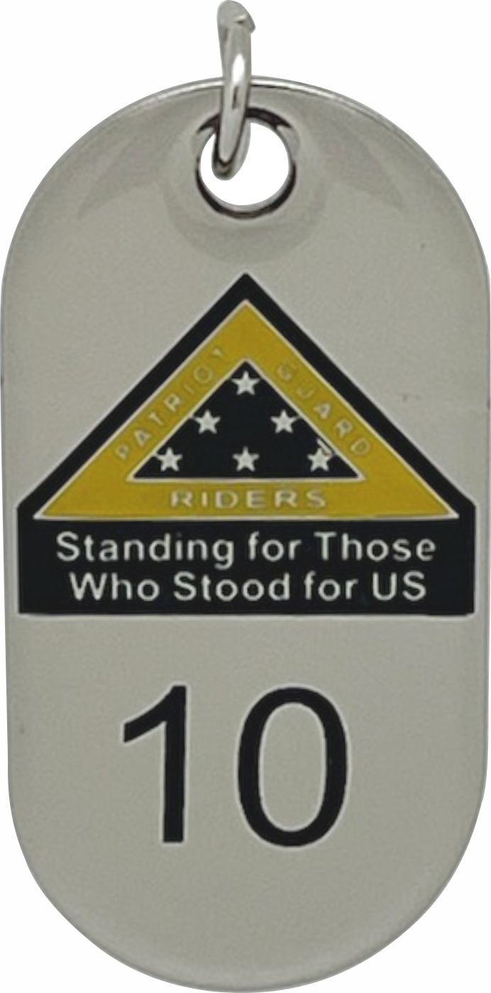 Thank you for your Patriot Guard Mission Support. This 10 Mission pin with clutch back attachment measures 1" tall x 1/2" wide.*** Pressing this pin into thick leather can result in breaking of pin. It is recommended to make holes through our leather via another method before attaching the pin ***