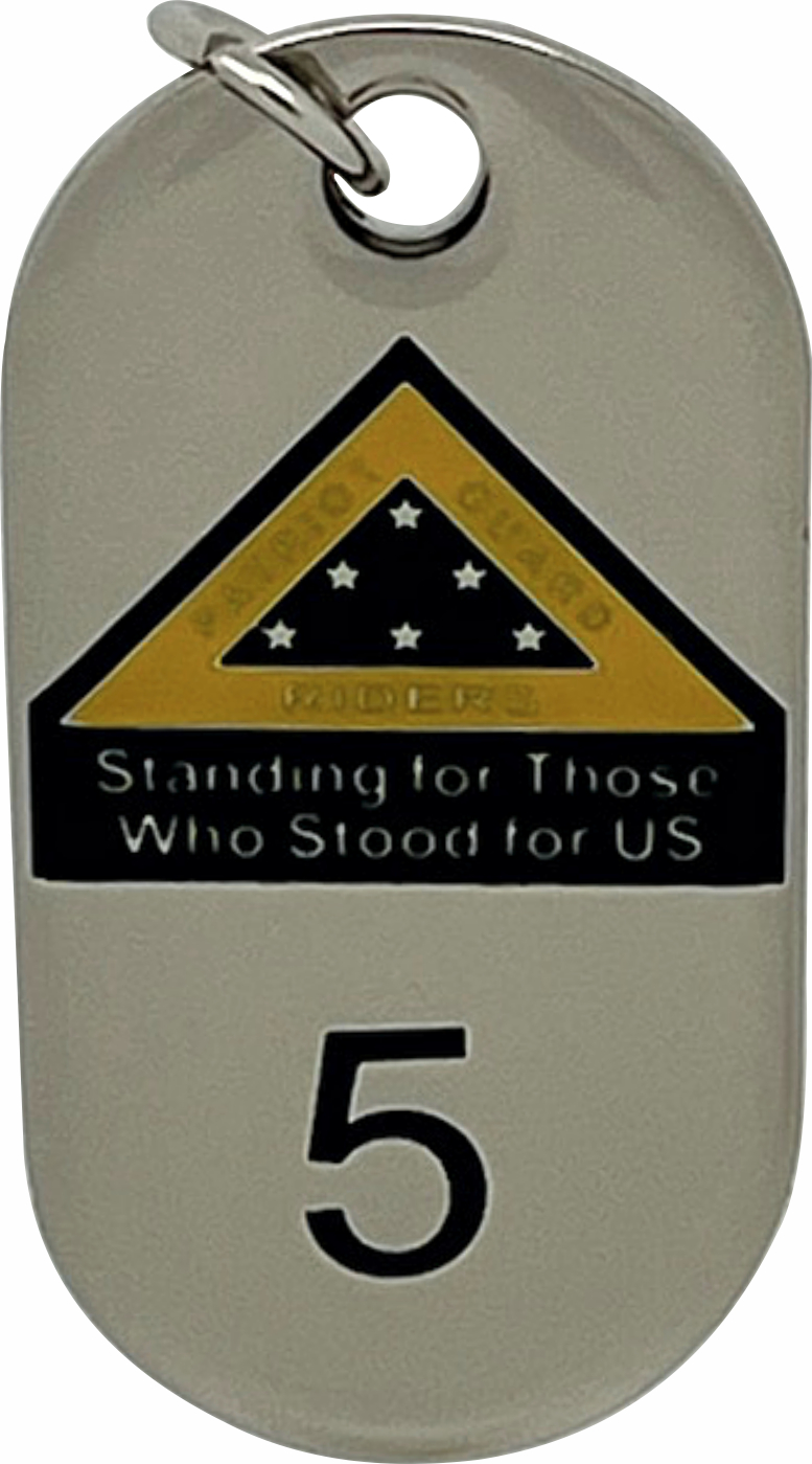 Thank you for your Patriot Guard Mission Support. This 5 Mission pin with clutch back attachment measures 1 3/4" tall x 7/8" wide.*** Pressing this pin into thick leather can result in breaking of pin. It is recommended to make holes through our leather via another method before attaching the pin ***