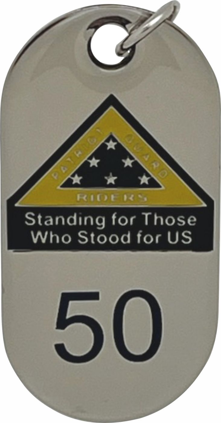 Thank you for your Patriot Guard Mission Support. This 50 Mission pin with clutch back attachment measures 1 3/4" tall x 7/8" wide.*** Pressing this pin into thick leather can result in breaking of pin. It is recommended to make holes through our leather via another method before attaching the pin ***