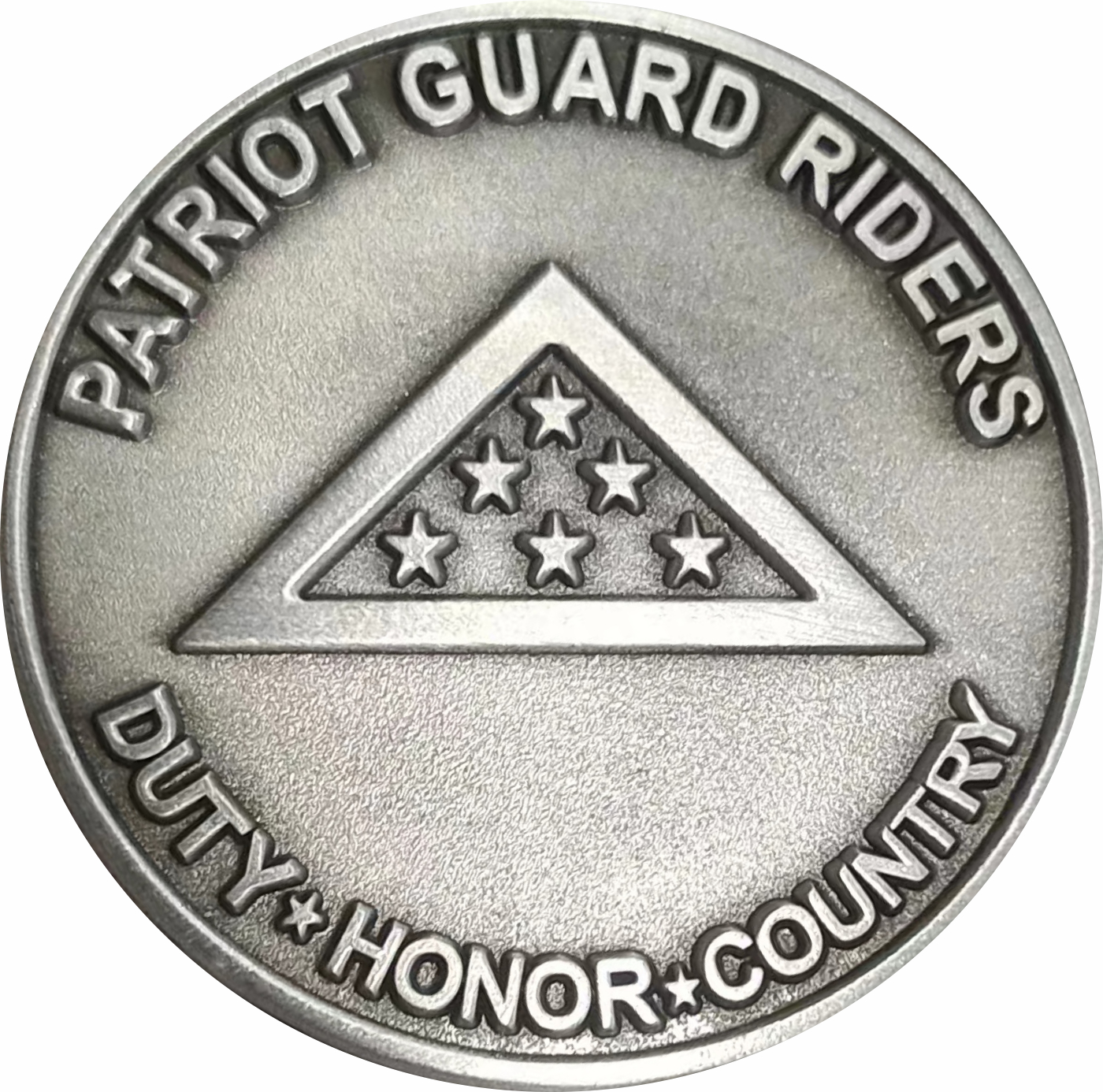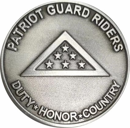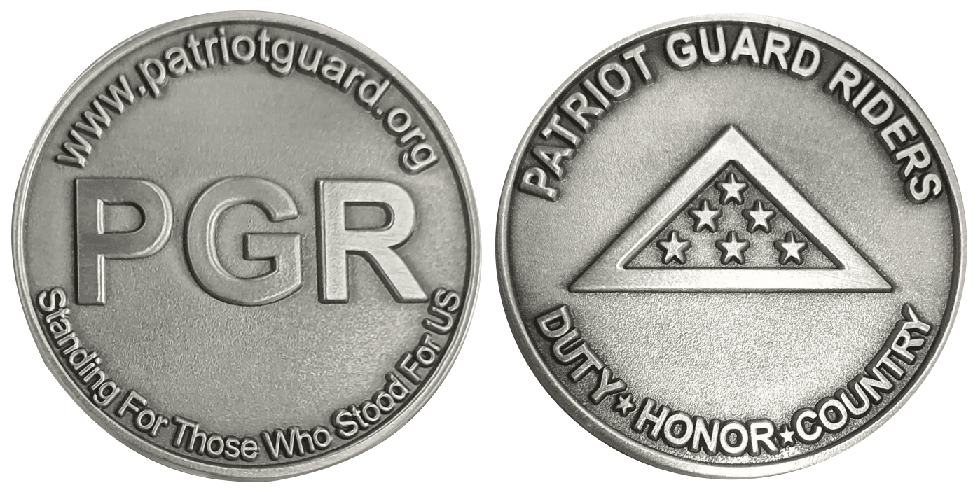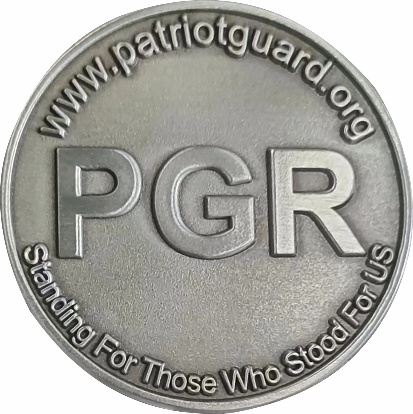 We are proud to offer this Patriot Guard Riders Zinc Alloy Coin. This coin is made of a quality zinc alloy, it measures 1 7/8" in diameter and is 1/16" thick.- "PGR", Website, & "Standing For Those Who Stood for Us®" on front