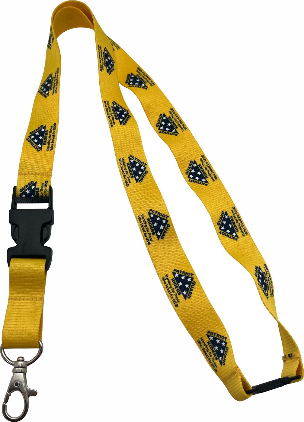 We are proud to offer this Patriot Guard Lanyard. This is a yellow lanyard with multiple Patriot Guard Riders logos printed across the length. It features a spring loaded swivel hook to secure a key or ID badge and heavy duty plastic clasp that disconnects. Measures 22 inches long from end to end by .800 inches wide.
