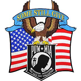 MilitaryBest is proud to offer this Eagle Emblems 12" POW MIA with Flag and Eagle Jacket Patch. This patch has a banner across the top stitched with We Leave No One Behind and it's quality is guaranteed.