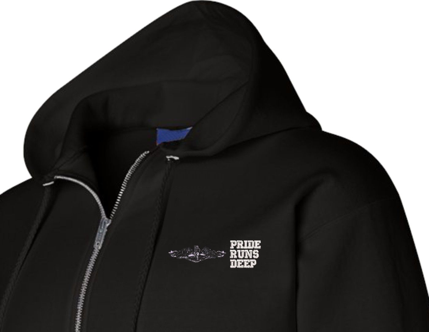 MilitaryBest is proud to offer this quality U.S. Navy Enlisted Silver Dolphins Pride Runs Deep Zippered Hoodie. Each U.S. Navy Zippered Hoodie is direct embroidered onto either a Champion or Gildan brand Zippered Hoodie using a 9.5 oz 50/50 Cotton Poly blend material. These Military Zippered Hoodies are proudly embroidered at our facilities in Scottsboro, AL.