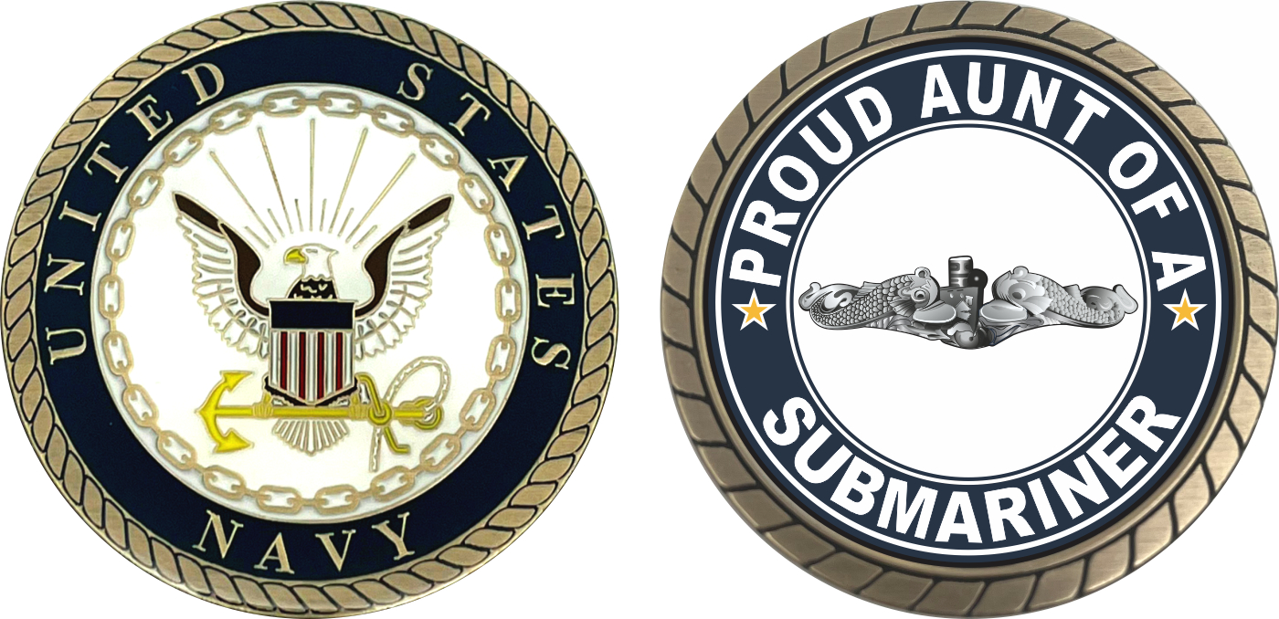 This 1 3/4” Proud Aunt of a Submariner Silver Dolphins Challenge Coin is proudly offered by MilitaryBest. This Officially Licensed Navy coin has beautiful enamel finish on one side and an organized crisp clean Proud Aunt of a Submariner design on the opposite side.