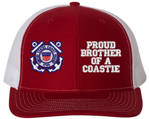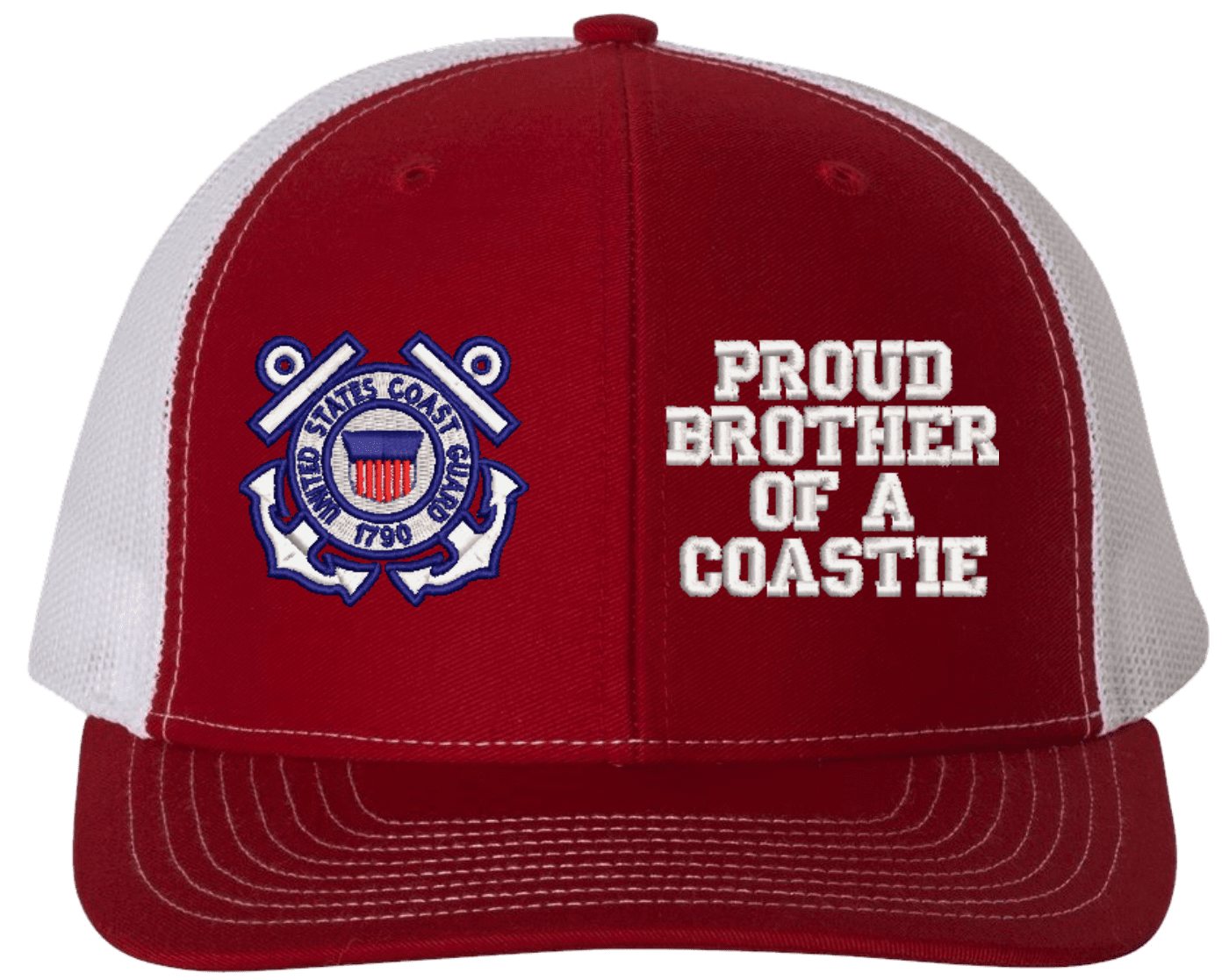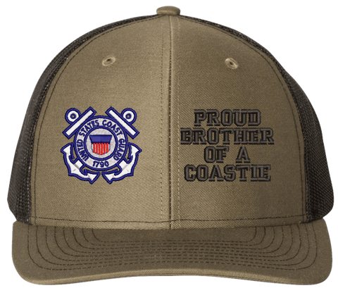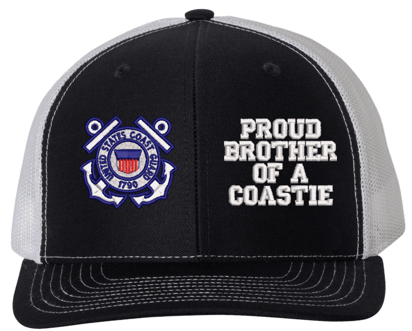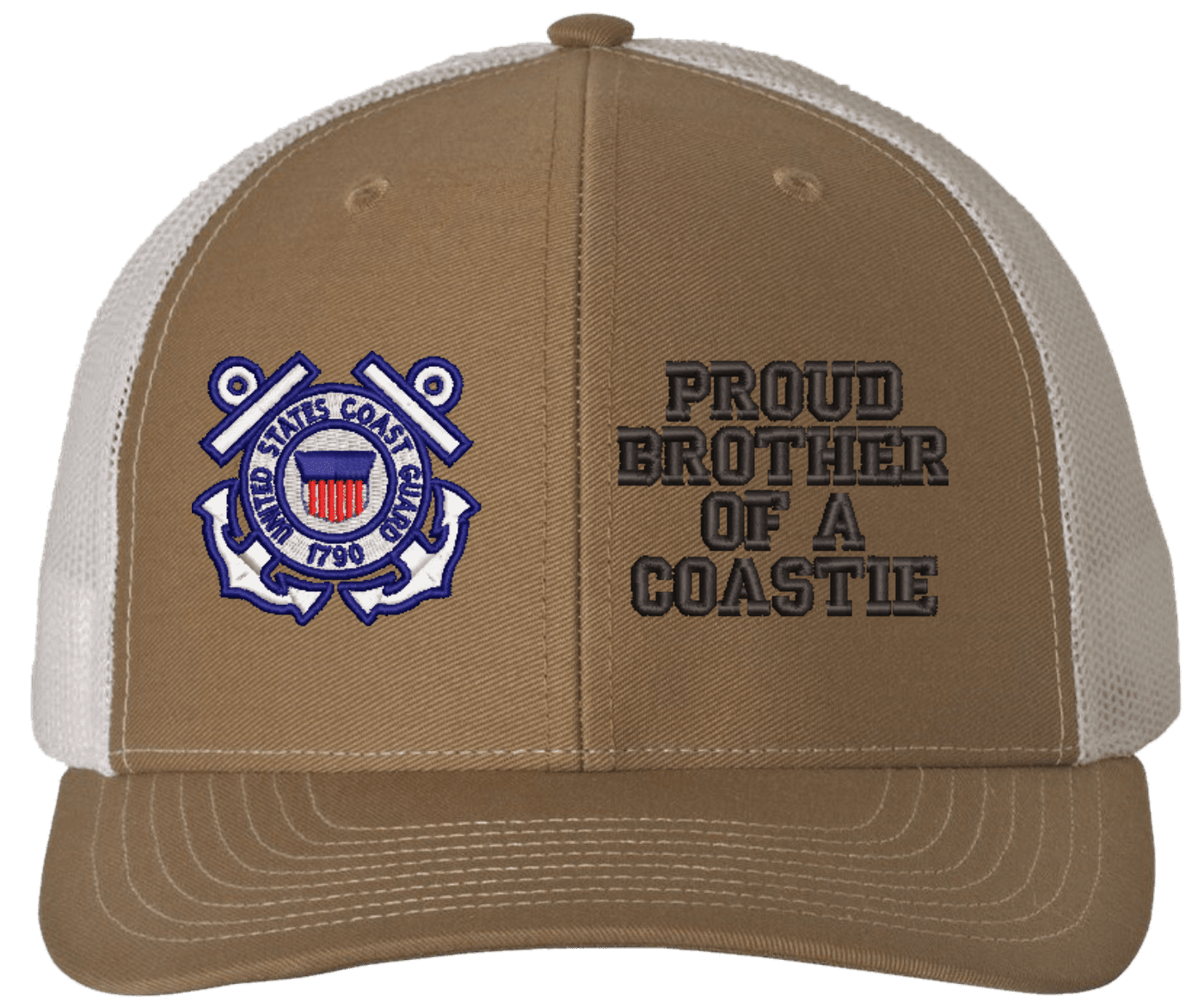 MilitaryBest is proud to offer this Proud Brother of a Coastie U.S. Coast Guard Mesh Back Cap. The design of this U.S. Coast Guard Cap is crisp, clean, and sure to be loved by people of all ages! Select above from our many cap colors. This Proud Brother of a Coastie U.S. Coast Guard Mesh Back Cap is crafted by our skilled embroidery technicians at our facilities in Scottsboro, AL. As with all MilitaryBest items, your satisfaction is guaranteed!Caps ordered with custom embroidered personalized back text require an additional 2 to 3 days production time. All custom back text will be embroidered in ALL CAPITAL LETTERS. Caps personalized with back text are non-returnable unless there is a material defect in the cap.