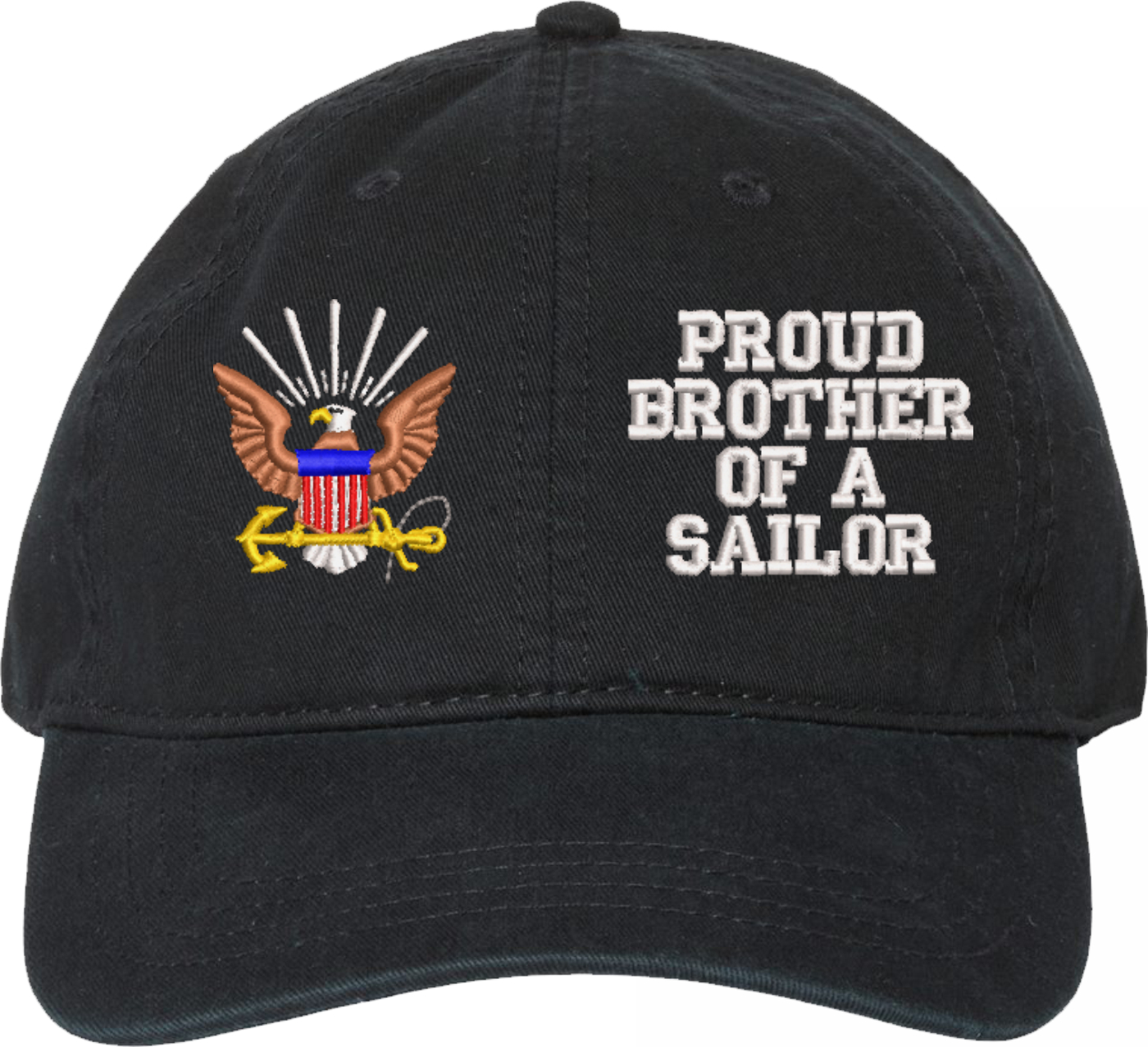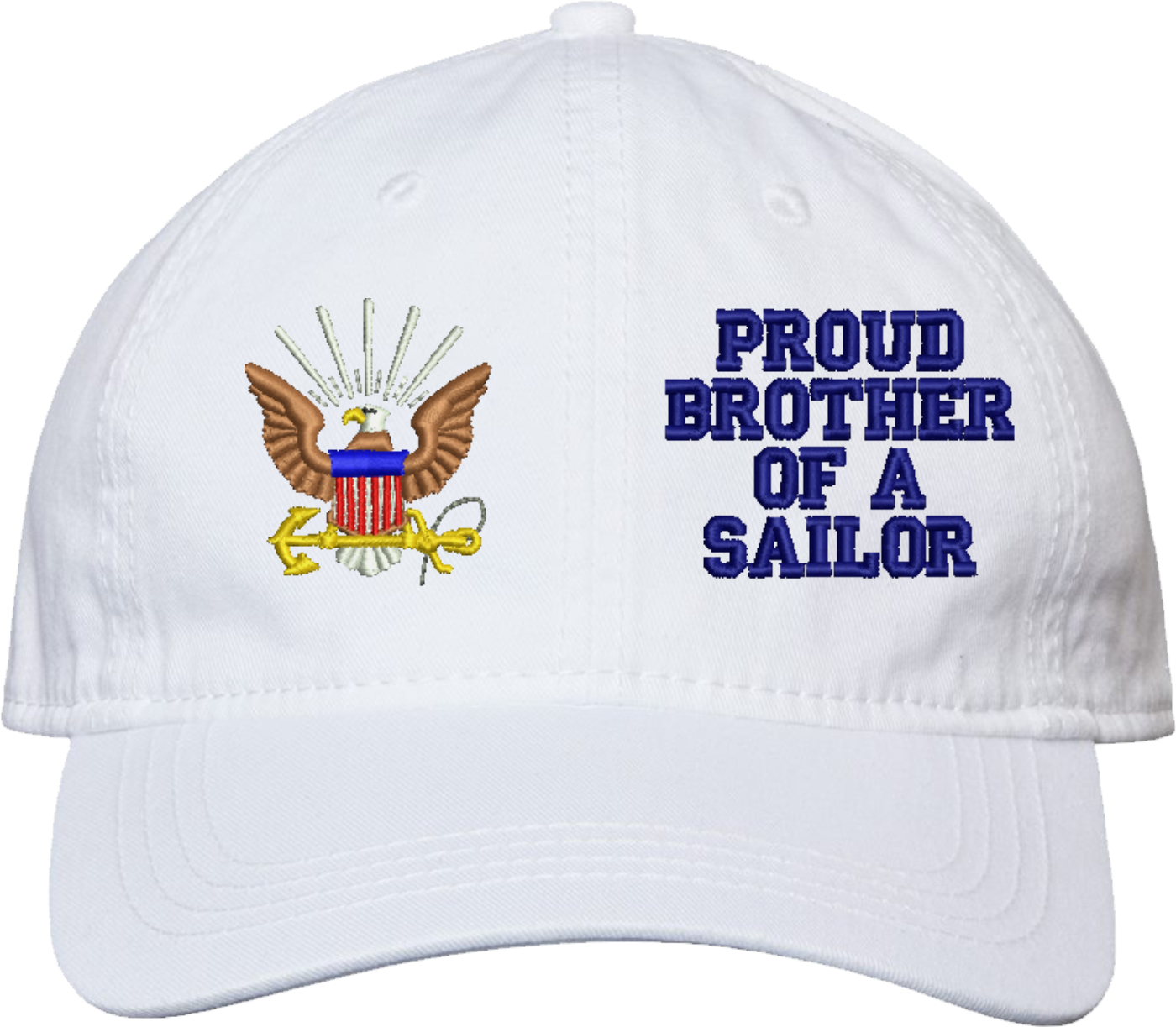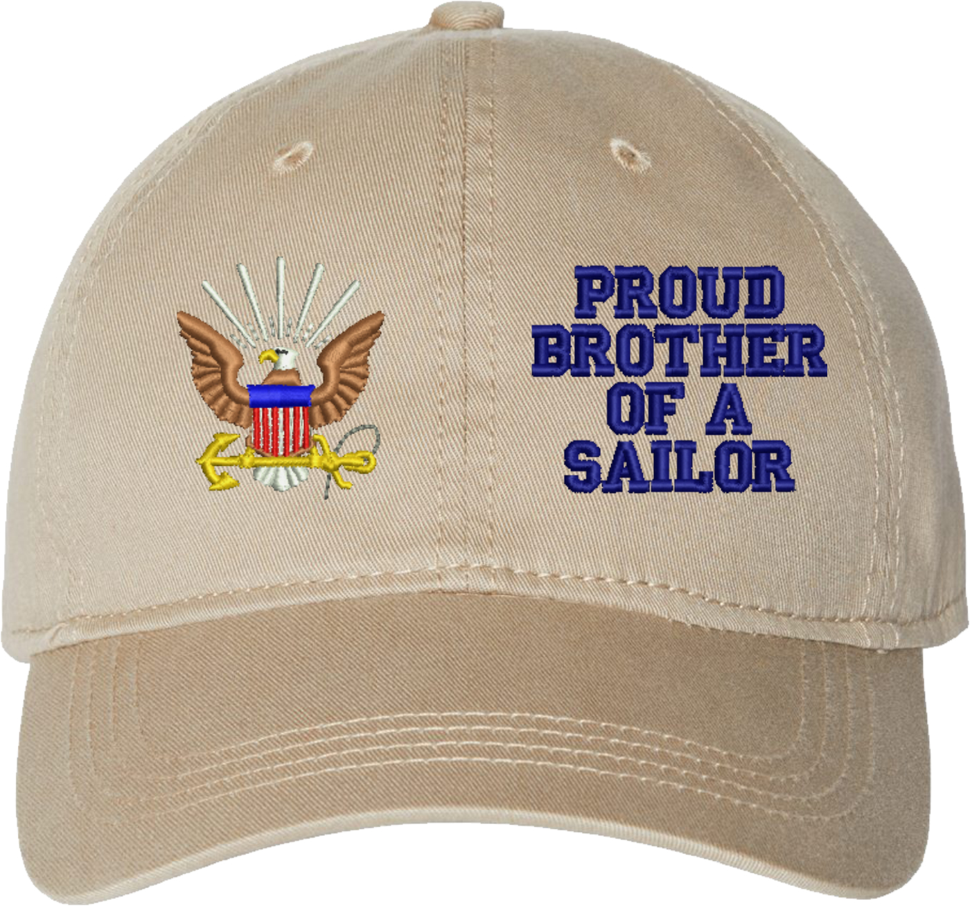 Show your Navy pride with this Proud Brother of a Sailor U.S. Navy Unstructured Dad Cap from MilitaryBest. Crafted from 100% washed chino twill cotton, this six-panel, low-profile cap offers a relaxed and comfortable fit. Featuring high-quality embroidery done in our Scottsboro, Alabama facility, this cap is designed with a pre-curved visor and an adjustable tri-glide buckle closure for a perfect fit. Whether for everyday wear or as a meaningful gift, this cap is a great way to honor your own or a loved one's service.For caps ordered with custom embroidered personalized text please allow an additional 3 to 5 days production time. All custom back text will be embroidered in ALL CAPITAL LETTERS. Caps with back text or eggs are non-returnable unless there is a material defect in the cap.